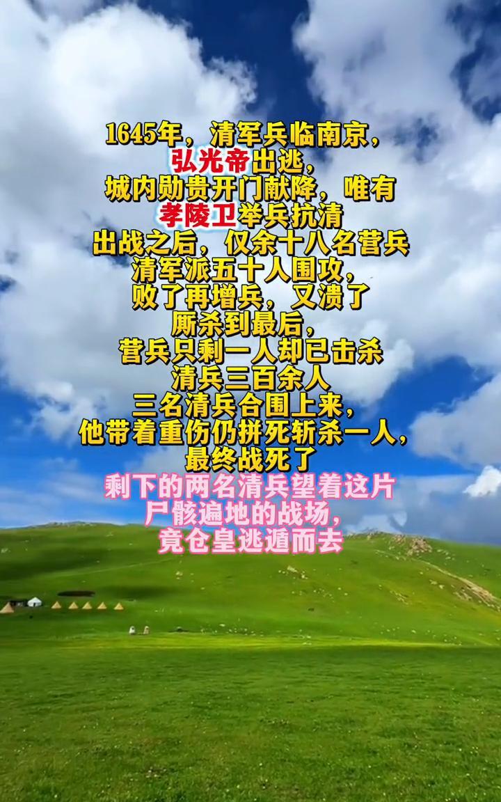 1645年,清军兵临南京,弘光帝出逃。城内勋贵开门献降,唯有孝陵卫举兵抗清。出战之后,仅余十八名营兵。清军派五十人围攻,败了再增兵,又溃了。厮杀到最后,营兵只剩一人却已击杀清兵三百余人。三名清兵合围上来,他带着重伤仍拼死斩杀一人,最终战死了。剩下的两名清兵望着这片尸骸遍地的战场,竟仓皇逃遁而去。