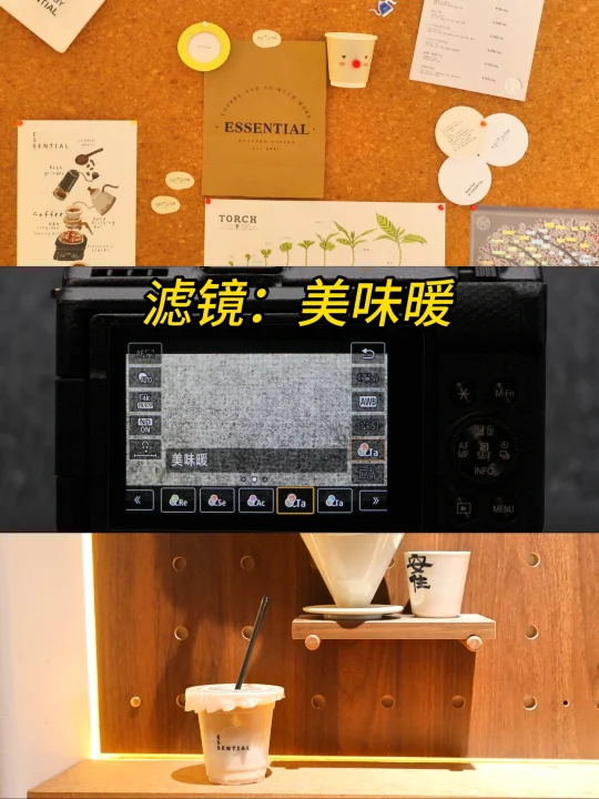 “美味暖”适合咖啡店打卡,探店拍摄,增加了一些色彩饱和度,带有一点点暖色调,拍摄的画面温暖好看