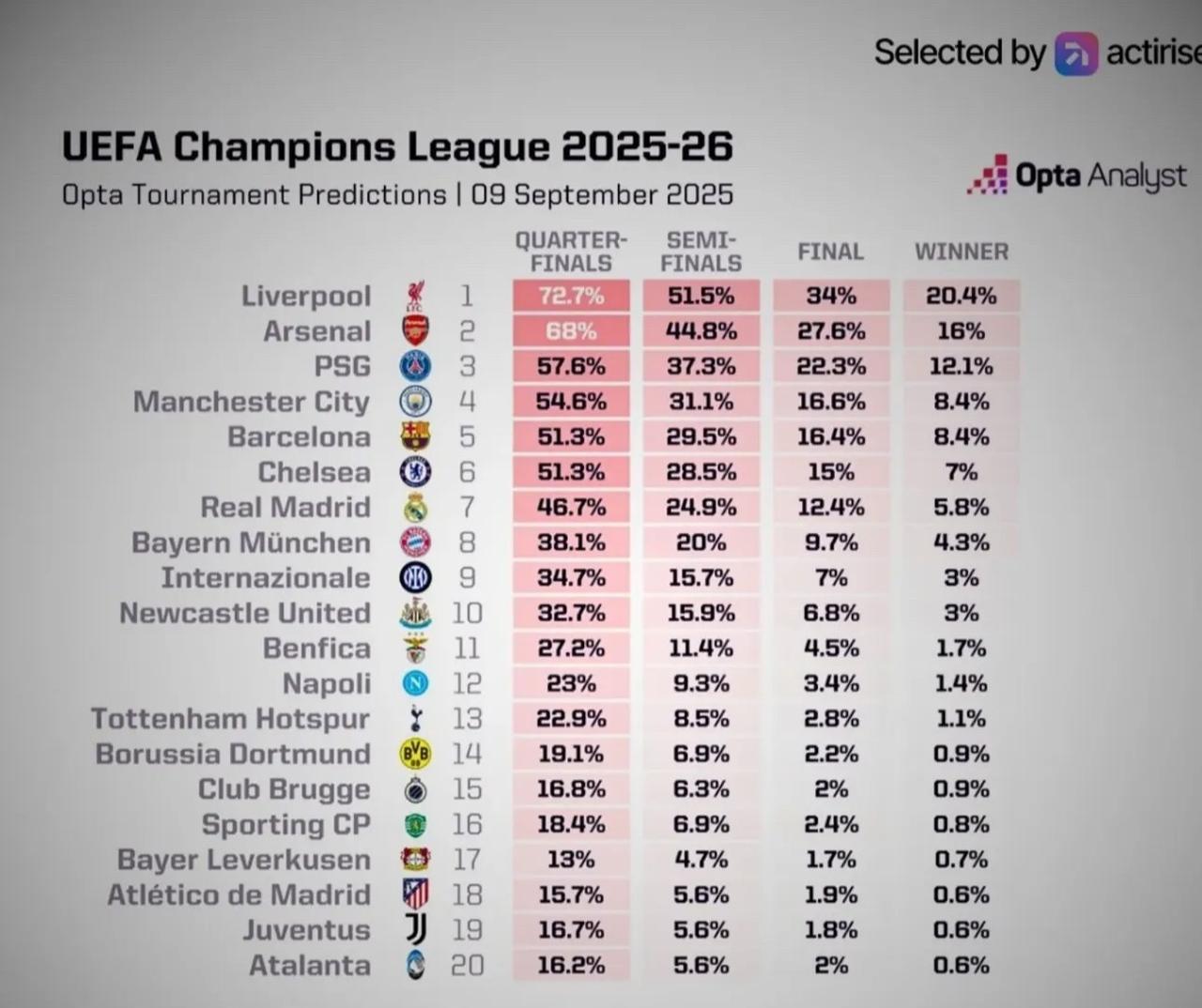 本赛季欧冠Opta预测利物浦夺冠率20.4%!国米仅3%,却是意甲第一 最新