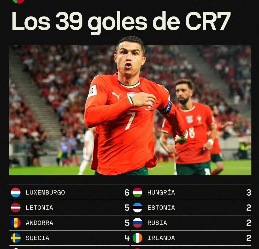 C罗世预赛39个进球几乎都是对阵欧洲鱼腩球队打进,分别是:卢森堡6球,拉脱维亚5