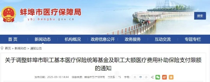 大皖新闻讯记者9月11日从蚌埠市医疗保障局获悉,该局发布了调整蚌埠市职工基本医疗保险统筹基金及职工大额医疗费用补助保险支付限额的通知。