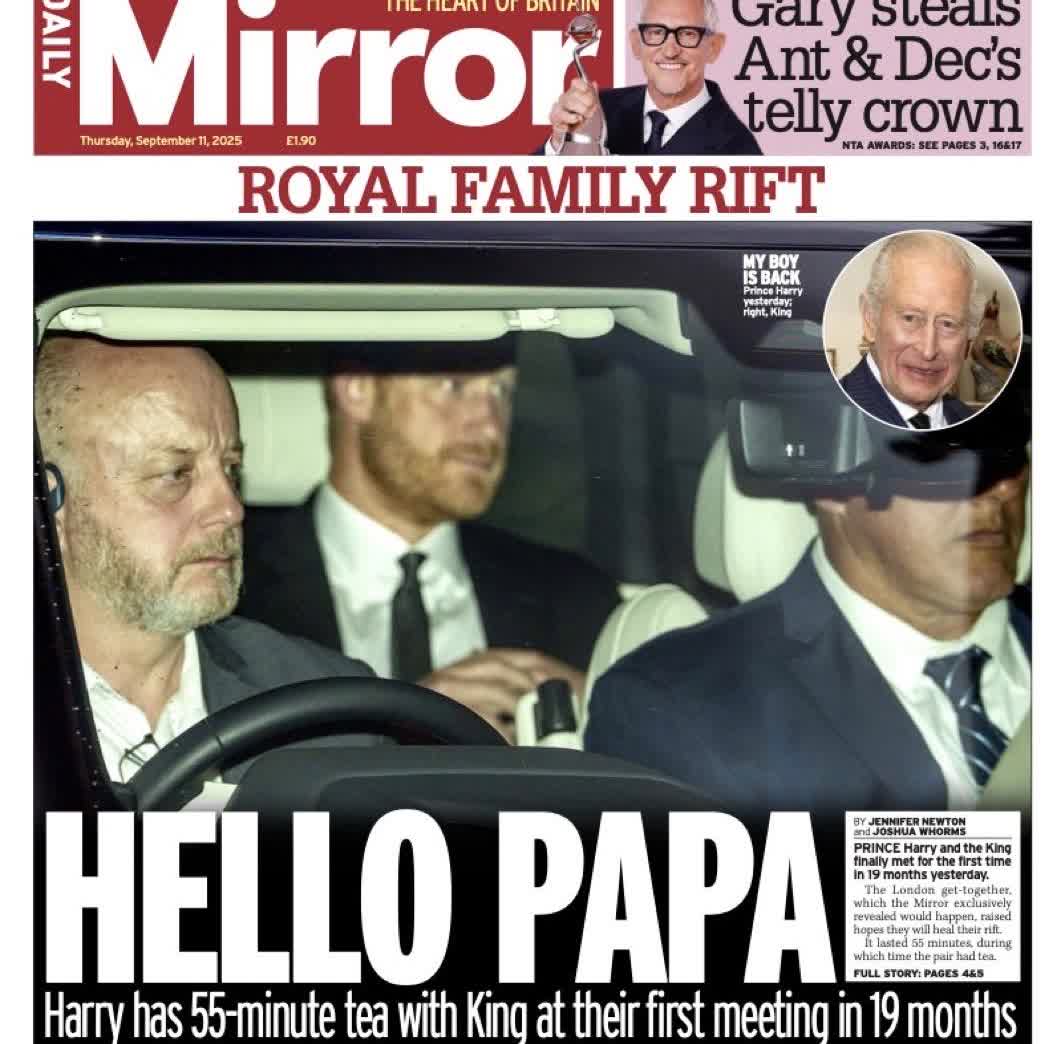 《太阳报》报道,英国哈里王子昨天与父亲英王查尔斯三世一起下午茶,虽然持续了不到一个小时,但已是两人过去19个月以来的首次见面。报道透露,两人是在伦敦市中心的克拉伦斯宫下午茶的,查尔斯在成为国王之前曾与夫人卡米拉住在这里。报道还指出,两父子上次会面是在2024年2月。 《每日镜报》也在头版刊登了哈里王子昨天乘车与父王查尔斯三世一起下午茶的照片。报道也透露,两人昨天的下午茶持续了55分钟,并为两人的修好带来了希望。