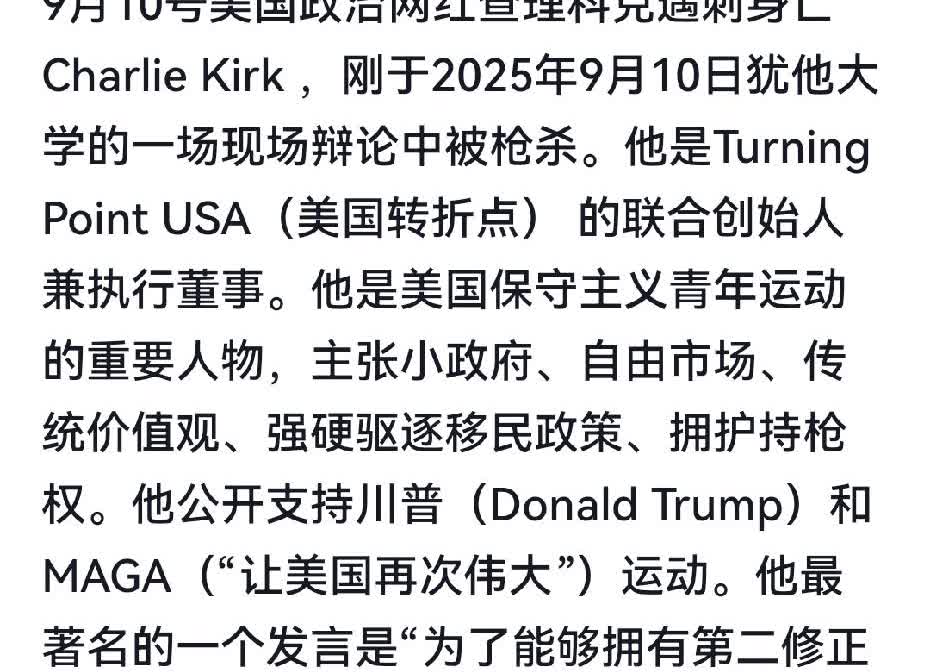 美国政治网红在一场辩论中遇刺身亡,嫌疑人被当场抓获,是一名白人老头…查理柯克支持特朗普,主张美国传统价值观:强硬驱逐移民、拥护持枪权等等。最著名发言是:为了能够拥护持枪法案,每年不幸付出一些枪支致死案例也是值得的…他的被杀一语成谶。