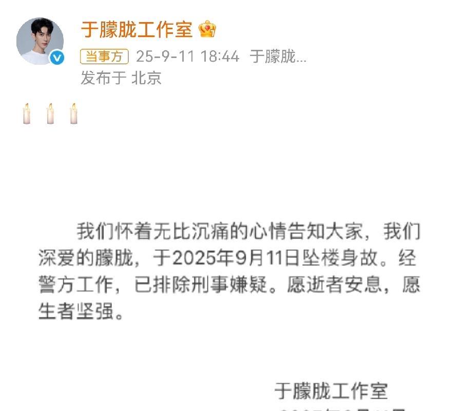 没有转机了,于朦胧工作室发声明了,人已经去世[流泪][流泪] 最开始没有发声明,应该是还在抢救,五楼头朝下,希望太渺茫了。 已经排除刑事嫌疑,也就是自杀,真的难以置信,明天还有节目要参加。 事业刚刚开始有起色,咋就想不开呢?