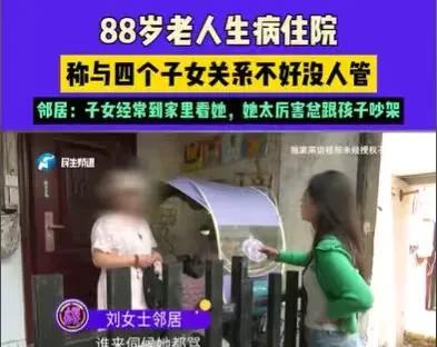 河南郑州,88岁老人生病住院,腰啊,腿啊,都肿了,走起路来步履蹒跚,没几步路就气喘吁吁的,4个子女都不理她,不但没人来照顾她,更没有人给一分钱,老人找来调解员,子女们却表示,老母亲太厉害了,她根本没有爱。 刘奶奶在病房,走起路来步履蹒跚,双手要扶着东西,如果不扶着,她随时都有可能摔倒,她跟调解员说,她的腰啊,脚啊,腿啊,都肿了,她浑身都疼啊。 但比起身上的疼,她更觉得心疼,如果不是生病,如果不是躺在病床上,她还真不知道她和子女的关系,竟然如此冷淡。 自从她生病以来,她就一个人在医院,连买饭都成问题,她试着联系子女,可是4个子女不是把电话挂了,就是联系不上。 她跟调解员说,自从老伴在十几年前离世之后,4个子女就不再理她了,子女们不但没有给她一分钱,还要她分钱出去,现在她只想子女们出钱给她请保姆。 为了解决刘奶奶的问题,调解员找到了刘奶奶的4个子女,然而从4个子女口中,调解员看到了刘奶奶的另一个面孔。 调解员找到刘奶奶的女儿,说起自己的老母亲,刘奶奶的女儿就痛哭流涕,她说她的母亲从小对他们就没有爱。 在他们还小的时候,都是靠父亲一个人挣钱,她什么都不干,但她依然还说自己苦,可那个时候谁不苦呀!她母亲就觉得自己苦,嘴巴还特别厉害,跟谁都吵架,一家人都害怕她。 她的脾气从那时候到现在,几十年了依然没有改过,她尝试过照顾母亲,可母亲天天跟她吵,事特别多,特别难伺候。 现在她不愿意养老母亲,但是可以和弟兄们一起凑钱,把母亲送到敬老院或者请保姆。 老人的二儿子也表示,要他们4个子女和老母亲共同生活,估计是没有人同意的。 他说其实父亲离世之后这十几年,他们作为子女的,也想好好对老母亲,让老母亲的晚年幸福。 可老母亲嘴巴实在太厉害了,虽然大家都定期来看老母亲,但不管谁来了,她都要吵架,都是来一回吵一回,大家都怕了。 调解员又找到刘奶奶的大儿子,大儿子表示已经和母亲不来往40多年了,他的母亲将他的妻子,儿子,还有孙子,都赶了出来,现在大家都不理她。 但是刘奶奶的4个子女都表示可以凑钱请保姆,或者让老母亲进养老院,并非刘奶奶所说的那样,4个子女不愿意理她。 他的4个子女只是不愿意和她一起生活而已,毕竟她的子女也有六七十岁了,有孙子,有后代,也有他们的生活,他们不愿意让老母亲影响他们的生活。 刘奶奶此刻也愿意反思自己几十年的人生,也承认了自己的嘴巴太厉害了,才会让子女们不愿意理她。 那么如何看待刘奶奶所遇到的问题呢? 首先,不管刘奶奶是怎样一个老人,不管她的脾气是怎样的,作为子女,对老母亲就有赡养的义务。 《民法典》第1067条规定:成年子女不履行赡养义务的,缺乏劳动能力或者生活困难的父母,有要求成年子女给付赡养费的权利。 即使大家不愿意和老母亲住在一起,那么他们也应该妥善安置老母亲的养老问题。 其次,刘奶奶本身的脾气很不好,从小对子女就缺少爱,所以才会让子女们没有生活在一个优良的家风中。 《民法典》第1043条规定:家庭应当树立优良家风,弘扬家庭美德,重视家庭文明建设。 如果刘奶奶善待子女,那么子女才会感受到母爱。