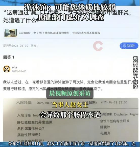 这下后悔了吧!浙江海宁,一女子去游泳馆游了几次泳,4天时间瘦了8斤,女子感觉不对劲,8月9日就去医院检查,不料,竟查出被感染了急性甲型肝炎,严重要面临肝移植,女子怀疑是游泳馆的水质不合格,才导致她患病,可游泳馆却称是女子体质弱,不适合游泳! “现在的人体质太差,自己生病还赖我们!”当女子找到健身房负责人理论时,竟得到这样的回答,殊不知,接下来的检测结果瞬间让他们无地自容! 谁能想到,一次普通的游泳,竟让她感染了急性甲型肝炎,一个月前,赵女士像许多人一样,打算走进游泳池享受一下夏日的清凉,可谁料,刚下水她就感觉不对劲,池水带着奇怪的味道,隐约间甚至能看到深水区有不明絮状物漂浮。 当她带着疑问询问教练,得到的回答竟是:消毒药剂残留,对人体无害!可接下来的四天里,赵女士经历了惊人的体重暴跌和持续高烧,原本以为只是普通的感冒,直到她站在体重秤上看到骤降8斤的数字,这才意识到问题的严重性。 起初,赵女士有着出国旅游的打算,看到自己体重下降,正符合她目前想要减肥的想法,曾一度暗自窃喜,但渐渐地她发现,吃药等根本不管用,丝毫没见好转。 再后来,随着病情再次加重,她甚至虚弱的连水都喝不下,被家人紧急送往医院后,医生的一番话,这才让她对游泳馆产生了怀疑,医生认为:赵女士是由于接触了被污染的东西,才导致感染! “我曾亲眼看到,教练从泳池里打捞出脏东西!”随后,第一时间,赵女士便联系了游泳馆想要协商解决,可对方竟称她体质太差,其余顾客都无问题为由,拒绝!这让她很是气愤,便带着卫生部门上门检测! 这起事件,恰恰折射出公共卫生管理场所的深层漏洞!不少不良商家,为了节约成本,会使用大量化学药剂对池水进行消毒处理,而非换水,甚至有网友表示:有的游泳馆一整夏都未必更换一次水。 每年夏季,类似于赵女士的遭遇频繁发生,各地均会出现因游泳而引发的感染事件,只是大多数人选择了沉默,甚至是怀疑自己吃错了东西,赵女士勇敢的站了出来,更是为了提醒大家,要多加注意安全卫生,用于保护自己的健康权利。 目前,卫生监督部门已经介入调查,最终检测结果将决定泳池是否受罚!但无论结果如何,赵女士的身体损伤再也无法回到从前,希望大家在出门游玩时,一定要更加注意安全健康问题。 只能说,公共健康无小事,当休闲场所成为疾病温床,我们每个人都可能是下一个受害者。对此,您是怎么看待这件事的呢? 信息来源: 潇湘晨报·晨视频|《4天瘦了8斤!浙江一女子患急性甲肝怀疑游泳导致,游泳馆:您体质较弱,卫健部门介入》 豫视频|《女子称在健身房游泳后确诊甲肝,卫健部门介入,初检水质不合格,当事人:诉讼程序已经启动》 文|梅林 编辑|南风意史