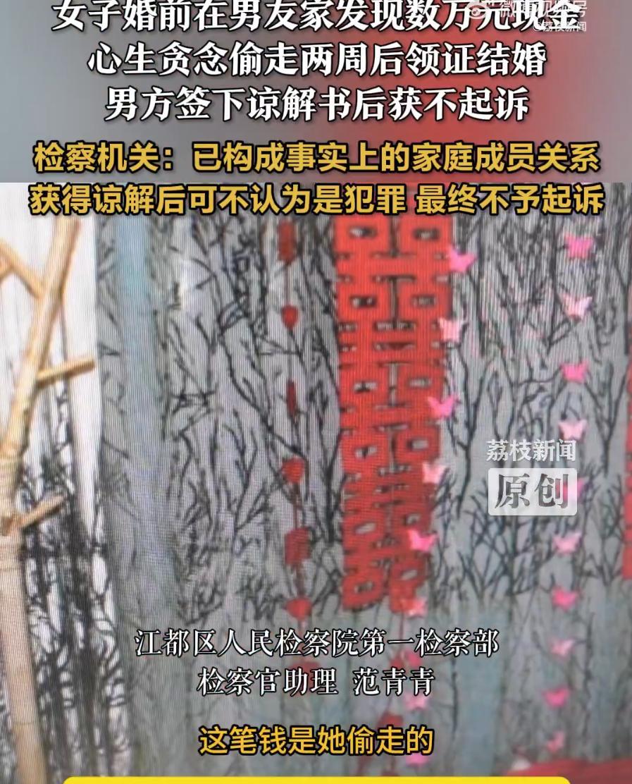 离谱!江苏扬州,男子突然发现家里的数万元现金不翼而飞,以为家里进了小偷,连忙带着未婚妻一起去报警,可调查后发现,偷钱的不是别人,正是自己的妻子,因为这期间两人结婚领证,男子最终选择了谅解 家里几万元现金突然不见,换作谁都会心里一紧,李先生和未婚妻刘某正忙着筹备婚礼,某天突然发现藏在婚房里的数万元现金不见了,因为家里并没有来外人,所以李先生第一反应就是进贼了 可民警调查时注意到,刘某表情不太对劲,说话支支吾吾,明显心里有事。再三询问之下,真相才浮出水面 原来根本没什么外贼,就是刘某自己在打扫婚房时偶然发现了李先生藏的现金,一时没忍住,悄悄拿走了 不过,这起盗窃发生之后不到两周,两人就去领了结婚证,成了合法夫妻。也正因这个转变,案件的性质彻底不同了 换作普通盗窃,这么大一笔现金,怎么都得立案处理。可因为他们随后结婚,已经构成事实上的家庭成员关系 司法解释里有个关键点,家庭成员之间的盗窃行为,如果获得谅解,可以不按犯罪处理。最后在检察官组织的听证会上,监督员、律师、社区代表都认为可以从宽处理,刘某也得到了不起诉的决定 不得不说,这个妻子也是够奇葩的,按常理来说,两个人都已经订婚了,婚礼筹备也在进行,钱迟早是共同生活里的资源。可刘某偏偏还是用“偷”的方式,等于把自己和未来丈夫对立起来 换句话说,本来可以光明正大说一句“我来管钱”,结果她绕了一圈,性质就变了,一个选择开口商量,一个选择暗地动手,带来的后果完全不同 虽然说丈夫最后选择了谅解,但这次的事不是一句谅解就能抹平的。钱能回来,信任未必能回来。夫妻关系说到底就是两件事:一个是感情,一个是信任。感情再深,信任一旦裂开,就会变成心里过不去的坎
