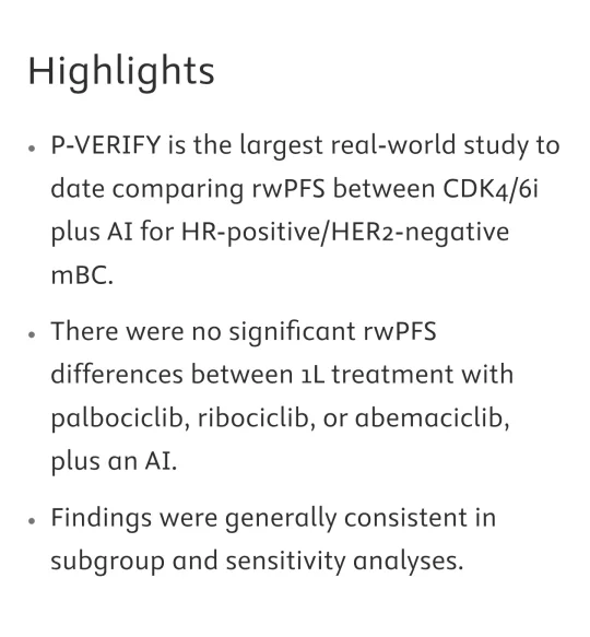 这项真实世界研究证实,三种CDK4/6抑制剂联合AI的疗效相当。临床决策应基于药物安全性、可及性及患者个体情况,而非单纯追求疗效差异。