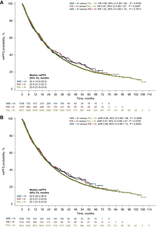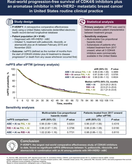 一项发表在《ESMO Open》的大规模真实世界研究(P-VERIFY研究),分析了美国9146例HR+/HER2-转移性乳腺癌患者的数据,比较了三种CDK4/6抑制剂联合AI的疗效。所有患者均接受一线治疗,其中: