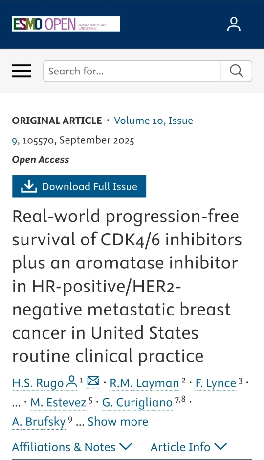 激素受体阳性(HR+)、HER2阴性乳腺癌约占70%以上,CDK4/6抑制剂(包括哌柏西利、瑞博西利和阿贝西利,因为是老外的研究,没有包括国产达尔西利)联合芳香化酶抑制剂(AI)已成为这类患者的晚期一线标准治疗方案。尽管临床试验已证实其疗效,但真实世界中的数据更能反映日常实践中的效果。