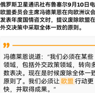 如果冯德莱恩这个提议获得通过,她将名垂青史。她想要废除欧盟外交决策一致性的原则! 说实话,一旦这个提议通过,那么欧盟里面小国的话语权就会越来越低,欧盟对小国的吸引力也会降低。 就比如,仍然是外交决策一致性的时候,德国想要提出一项议案,但是这个议案对一个小国不仅没有利益,反而还会牺牲掉一部分利益,这个时候小国就可以行使一票否决权的能力。 但是,如果冯德莱恩这项提议通过了,小国就失去了一票否决的权利,就只能被迫的少数服从多数! 但是,很多国家还是支持冯德莱恩的,觉得这个提案是非常必要的。他们觉得这么大的组织,应该是少数服从多数。 因为一个组织没有了步调一致性的话,这个组织的执行力是欠缺的,不能因为一个人的反对而否定了大多数的意见,对于反对者来说,可以保留意见。这样既符合组织原则,也不会失去利益的平衡。 总之,冯德莱恩这项提案能不能通过,到底有没有可行性,我觉得可以试行一下看看效果。可以就留下,不可以就废止!