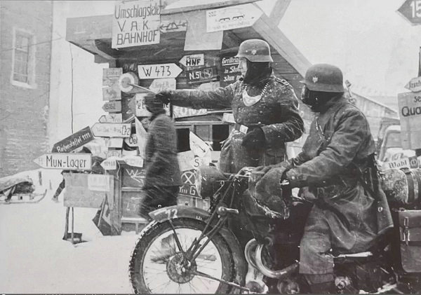 在道路交叉口执勤的德国宪兵和国防军第10装甲师的三号H型坦克,1941年11月或12月摄于苏联斯摩棱斯克州的格扎茨克(今名加加林),该地位于斯摩棱斯克至莫斯科的铁路线上,距莫斯科约180公里。 注意那名宪兵脚下夸张的大鞋,我们常在表现斯大林格勒战役结局的镜头中看到。这种靴子是手工草编的,因为德军无法提供足够的御寒衣物,前线士兵只有用编织草靴和用报纸包裹四肢的办法试图抵御严寒。