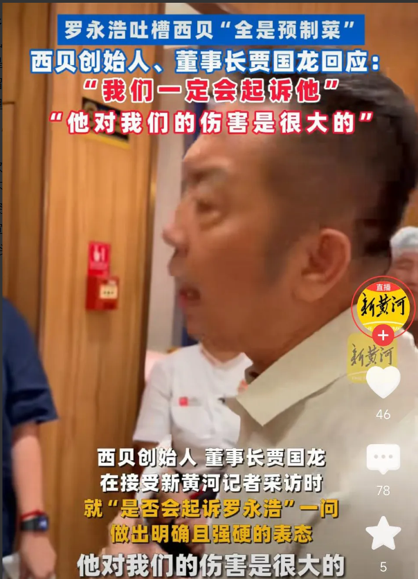 西贝贾国龙再怼罗永浩:这个人简直太坏了,狗咬我一口,我不能去咬狗一口! 网友表示: 西贝这次让老罗牵着跑,西贝还不是很会玩互联网,玩流量。不管结果怎么样,老罗己完胜! 要是真是预制菜,就赶紧道歉吧,跟老罗斗嘴,想想王自如的下场!老罗刚得很! 罗永浩说的很对啊,又贵菜量又少,还预制菜,不知道为啥还能活下去? 大家都吃过西贝,现在菜品怎么样,都有感触,罗永浩心直口快讲出来了,不理解西贝总要去证明什么,良心是个好东西,可有可无,但最起码诚实吧! 支持罗永浩,预知不预知留待后话,西贝越来越糊弄、量少价高是事实吧?自己什么价格、什么出品,自己心里不清楚?也甭拿档次说话,就一开在商场里的普通层次,价格堪比五星(200的标准,男的吃不饱,是事实吧?)不好吃还不让骂?那个鱼永远是腥的,吃完了不能说? 吃过一次,再没去过第二次。罗永浩只是说出了许多人的感受,区别是他比较有名,影响力比我们强。姓贾的不要嘴硬,正确面对人家问题就完了! 其实,邀请罗永浩随机去突击参观任何一家店的厨房,不就清清楚楚吗?如果都是现做的,还可以来一波免费宣传!
