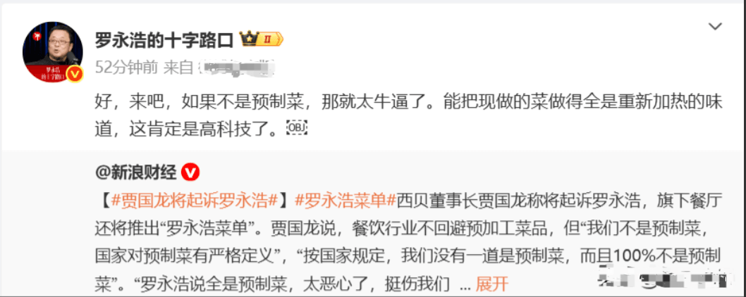 罗永浩回应西贝贾国龙 9月11日晚,罗永浩在微博转发“贾国龙将起诉罗永浩”的消息时评论称:“好,来吧。如果不是预制菜,那就太牛了。能把现做的菜做得全是重新加热的味道,这肯定是高科技了。”此后,罗永浩还发布了多条微博和网友互动,称如果有了解西贝是否使用预制菜内幕的朋友请联系他,还提出如果有录像将提供奖励等。