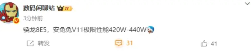 天玑9500比天玑9400+跑分多了100万分,性能提升有点猛啊,发哥这次要开挂了啊! 天玑9500安兔兔V11跑分400W+,CPU 104W,GPU 150W,来自vivo X300 Pro 16+1TB, 天玑9400+安兔兔V11跑分285W+,CPU 85W,GPU 100W, 跑分提升的挺多的,不过功耗也增加了挺多,千万别为了增加性能,给整成大火龙。 站哥爆料,骁龙8E5,安兔兔V11极限性能420W-440W,比天玑9500更强, 期待最新处理器的表现,只要不是火龙就行。