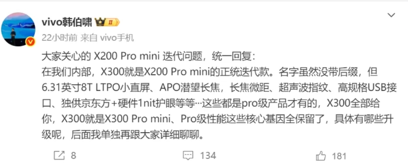 蓝厂高层称,接下来即将发布的新机vivo X300就是上一代vivo X200 Pro mini的正统迭代,并宣称6.31英寸8T LTPO小直屏、APO潜望长焦,长焦微距、超声波指纹、高规格USB接口、独供京东方+硬件1nit护眼等等这些都会给到X300,算了一下时间,好像还真是正好到了vivo X系列迭代的时间--去年10月、今年也是差不多的10月左右。 不过我在想一个问题:蓝厂你终于也意识到vivo X200 Pro mini命名上的不妥了吗?又 Pro又mini的,搞得花里胡哨的,本来挺好的一款小屏旗舰就因为这个命名...所以我盲猜上一代的vivo X200 Pro mini这种骚命名将会成为历史,而隔壁的黑厂应该也差不多也消停点了吧?