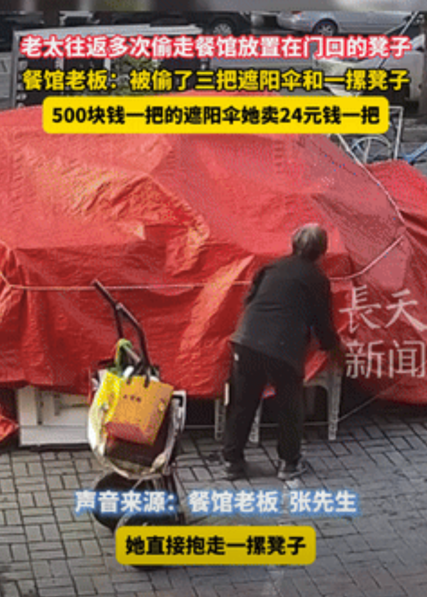 一家餐馆老板遭遇了令人意外的损失:连续几天,店外的桌椅和遮阳伞接连消失。调取监控后发现,一位老太太推着小车,在三天内多次“光顾”,不仅搬走了多张凳子,连沉重的遮阳伞也没有放过。