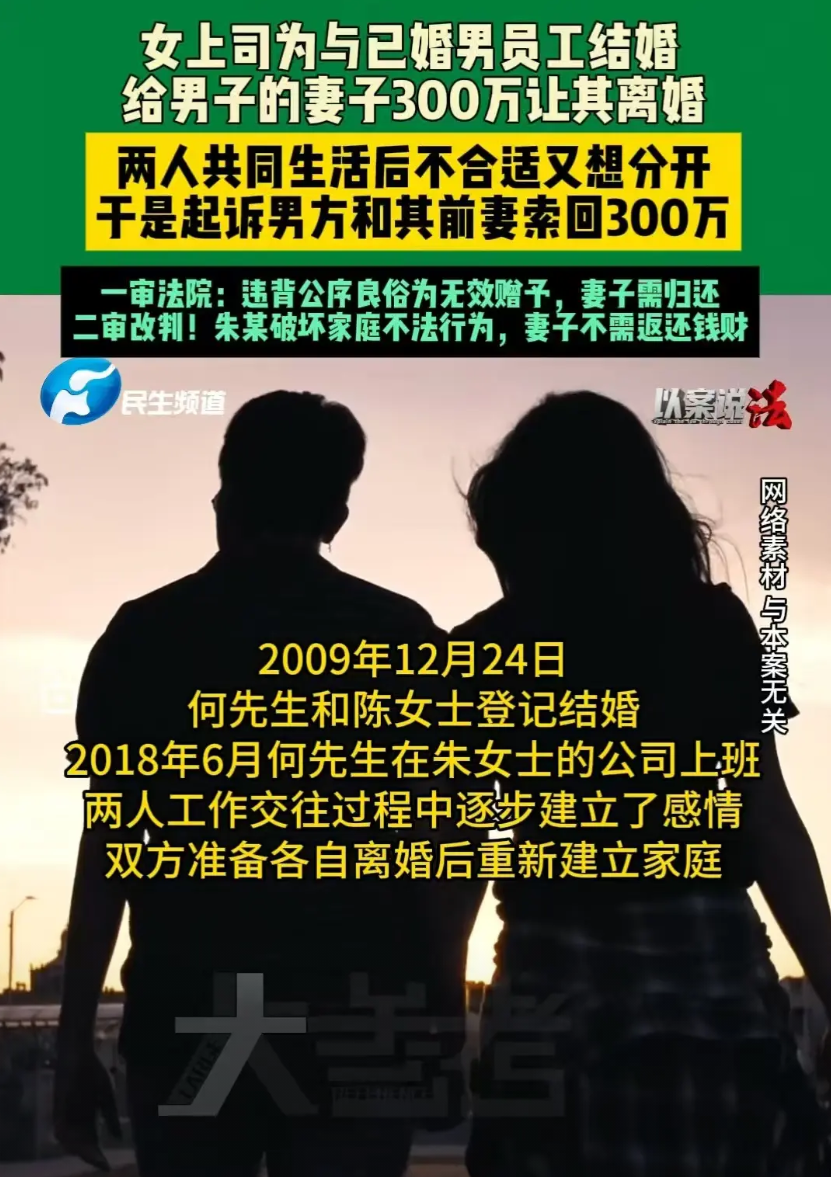 一审法院认为,朱女士向陈女士支付300万元属于“赠与行为”,但该赠与是为了促成何先生离婚、进而与自己结婚,本质上违背了婚姻家庭的公序良俗,因此认定赠与无效,判决陈女士需归还钱款。