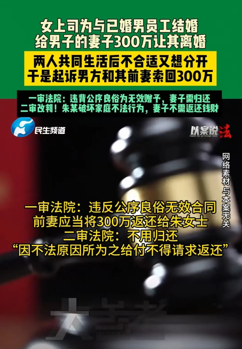 但二审判决却不一样了,朱女士明知是违法行为,还给予对方300万买断别人的婚姻,这种给予的钱不予归还。