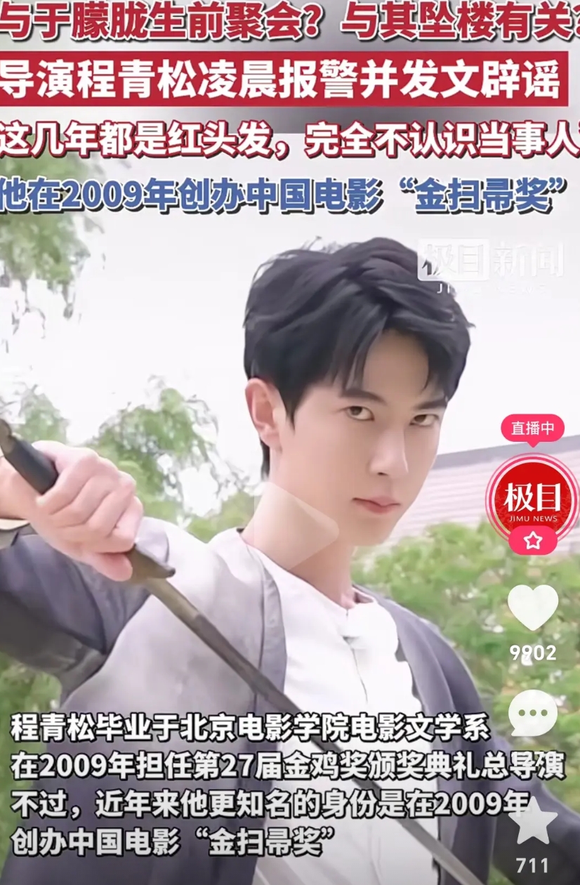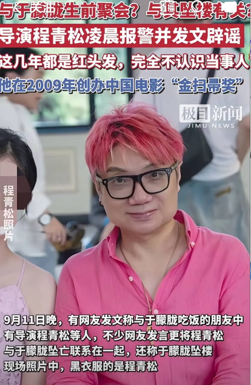 9月11日晚,有网友发文称与于朦胧吃饭的朋友中有导演程青松等人,不少网友发言更将程青松与于朦胈坠亡联系在一起,还称于朦胧坠楼现场照片中,黑衣服的是程青松。
