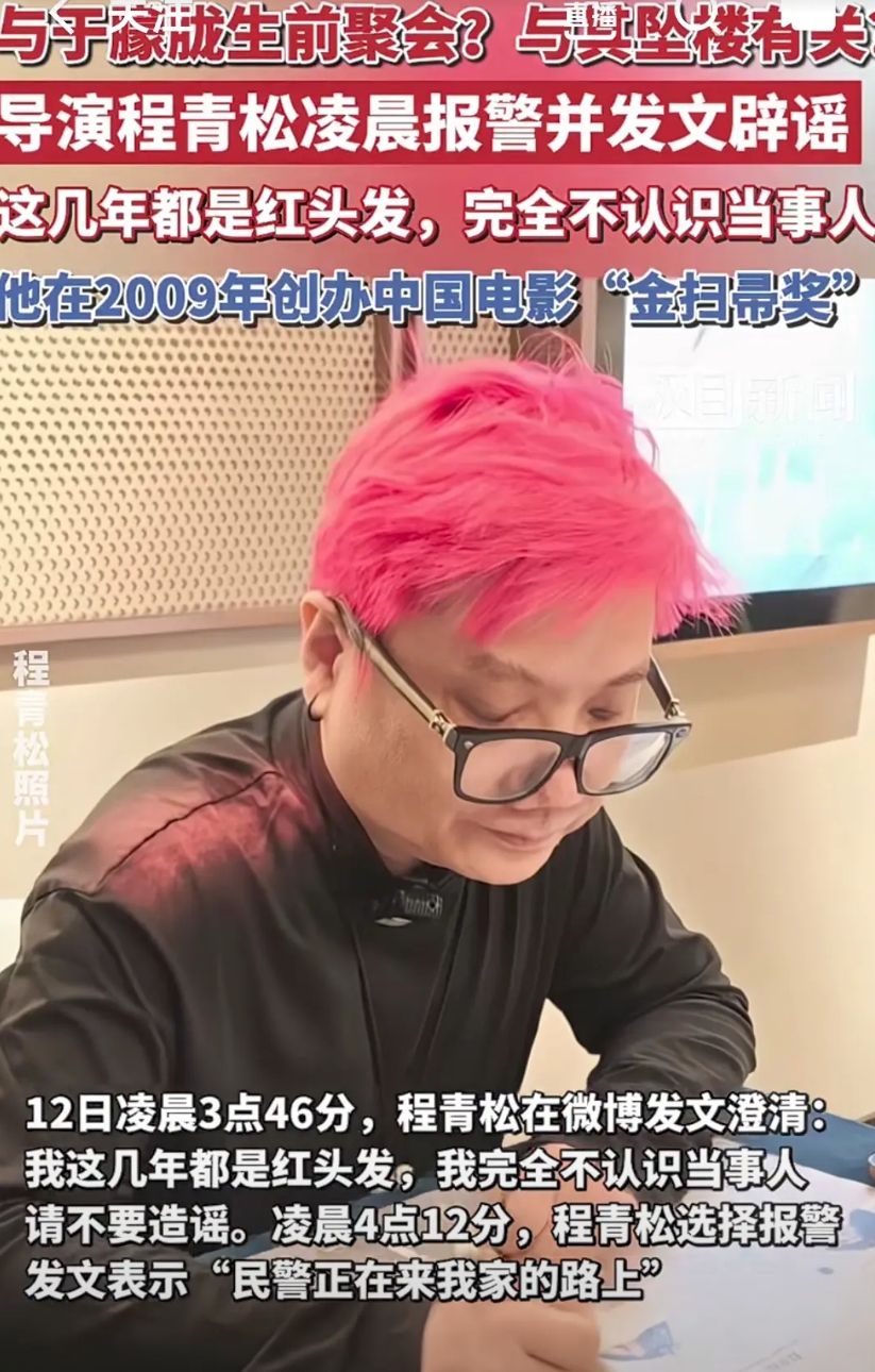 12日凌晨3点46分,程青松在微博发文澄清: 我这几年都是红头发,我完全不认识当事人请不要造谣。凌晨4点12分,程青松选择报警发文表示“民警正在来我家的路上"。