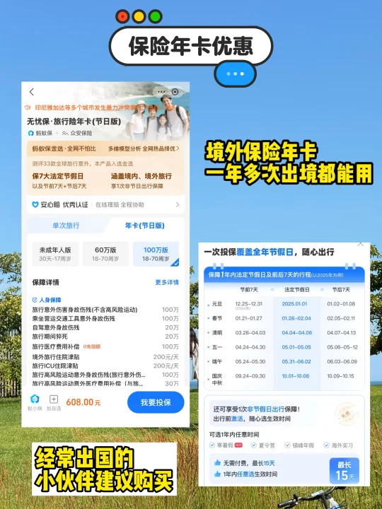 1️⃣有年卡:像我这种经常出国的人,一年多次出境都能用,不用每次重新买。