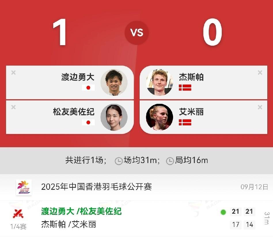 2025年中国香港羽毛球公开赛,混双1/4赛渡边勇大/松友美佐纪21-17,21