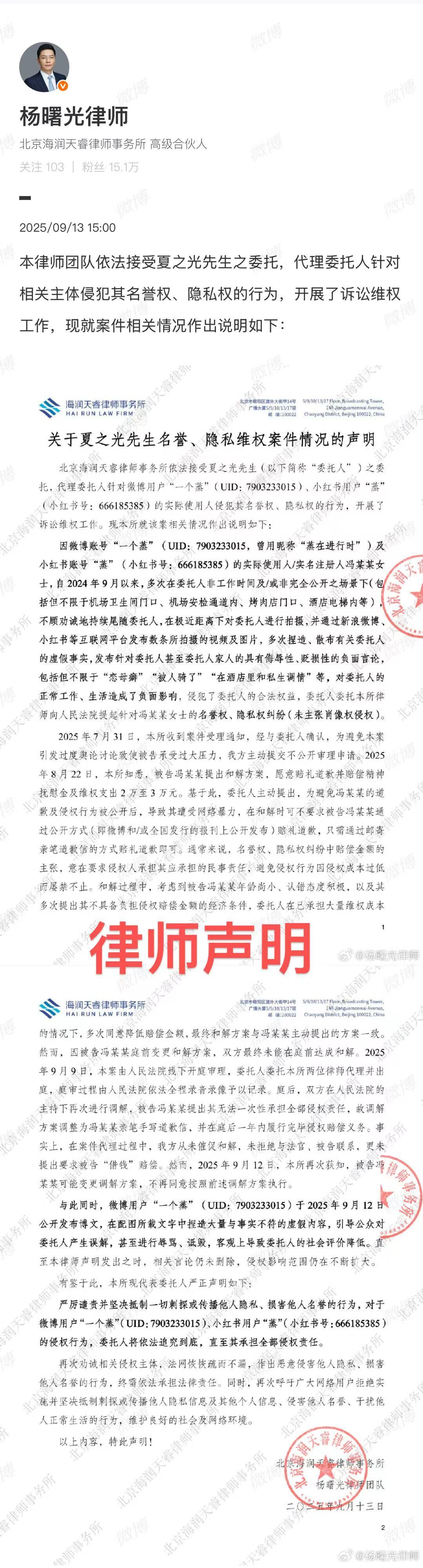 所以是已经被定性的rz+ss为了躲过制裁和赔偿,颠倒黑白污蔑夏,且卖惨给自己洗白,好一个神之反转,夏之光考虑到年纪小甚至都不要求她在线上发布道歉信,怕她被wb,一再退让,结果得到的是再次造谣。支持维权! 夏之光律师声明夏之光维权案件情况声明
