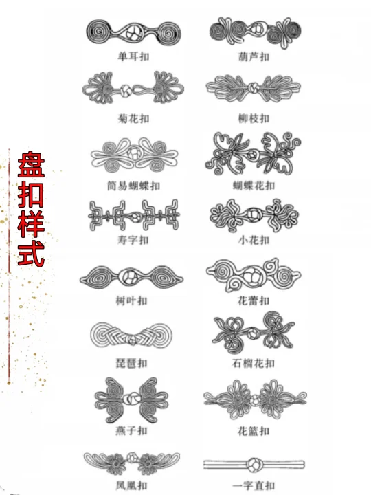 ✅秦出现“盘扣”雏形,以对称盘花的形态作为扣子出现是明代后期,民国时期因旗袍的流行盘扣的使用更为普遍,后被沿用至今。