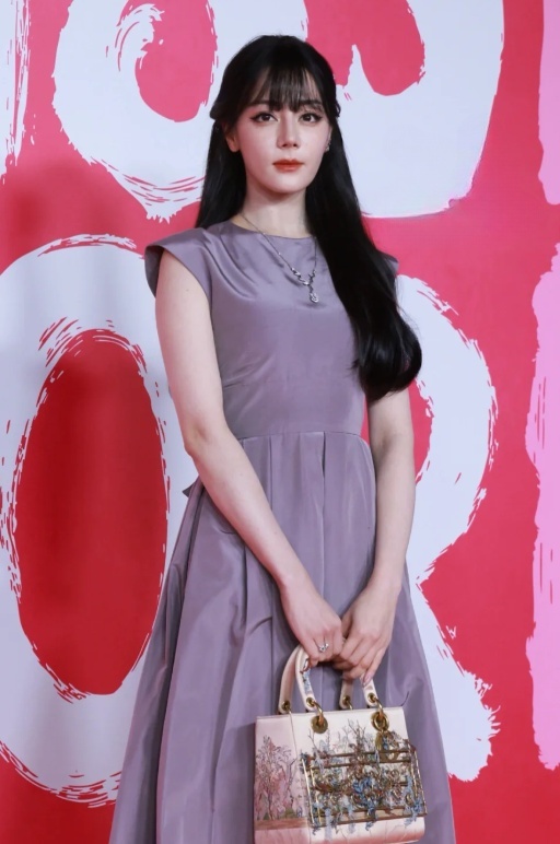 迪丽热巴身穿Dior紫色连衣裙搭配珠宝和手袋出席品牌线时尚活动