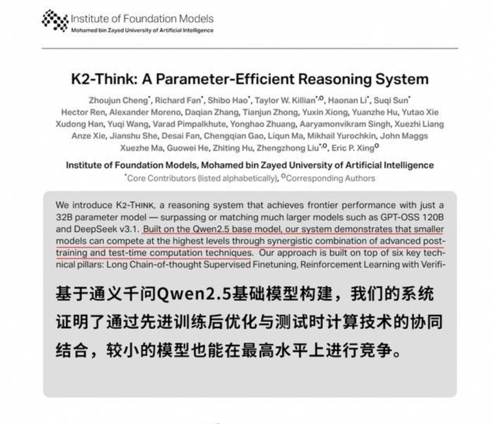 国内知道的人不多,但海外已经传开了,美国在AI领域最担心的事还是发生了! 阿联酋的穆罕默德·本·扎耶德人工智能大学和G42公司合作,从2025年初开始搞这个项目,用阿里巴巴的Qwen2.5-32B作为基础模型。Qwen2.5是开源的,有320亿参数,支持29种语言,包括阿拉伯语,预训练数据达18万亿令牌。他们优化了长链思维和投机解码算法,让模型在数学、科学和编码任务上表现突出。在MMLU基准上得分超过85,在HumanEval上高于85,在MATH上达80,超过Llama-3.1-70B这些竞争者。团队用Cerebras的晶圆级芯片跑模型,速度达到每秒2000令牌,比GPU快20倍,成本低很多。这让中小机构也能用上高级AI,不用花大钱买闭源服务。 9月9日他们在阿布扎比正式放出K2 Think,作为开源模型,代码和权重全公开,上Hugging Face平台。大学说这是他们AI主权的体现,避免靠单一供应商。K2 Think专注高级推理,能处理复杂问题,像物理模拟或逻辑谜题,输出结构化JSON格式。相比OpenAI的闭源,它更高效,参数少但性能匹敌DeepSeek-V3.1。阿联酋选择Qwen2.5是因为测试中发现它多语言支持好,社区活跃,文档齐全,便于本地改。G42的专家参与优化,集成vLLM和Ollama工具,确保兼容性强。发布后下载量很快就上去了,用户反馈说速度快,适合工业应用。 这个事直接戳到美国AI的痛点,他们靠闭源控制市场,但开源模式让技术扩散快。中国Qwen系列衍生模型超14万个,全球开发者用脚投票。阿联酋的举动说明客户看重实用性,不是光听名气。辛顿在2025年上海会议上说过,中国对AI认真,美国管制反而帮对手加速。K2 Think证明小型模型也能挑战巨头,标志开源在领跑。阿联酋政府把这当国家战略,融入经济计划,推动本土计算能力。模型的六大支柱包括高效参数利用和工具调用兼容,让开发者建AI代理。相比美国企业,阿联酋开源吸引全球贡献,形成创新循环。 美国观察家注意到,中国技术在中东落地,担心市场主导弱化。Qwen2.5-Max用混合专家架构,能处理文本、图像、视频,扩展范围广。K2 Think的发布象征合作模式变,让更多国家进智能时代。团队计划融入Qwen2.5-Omni-7B的多模态功能,未来迭代更多。MBZUAI的研究所继续推动,吸引投资,阿联酋想成AI中心。开源策略降低门槛,汇聚资源,这事在海外传开,国内还安静,但格局变化已开始。