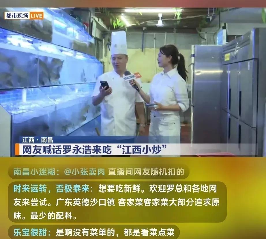 江西小炒是懂得接流量的! 罗永浩今晚开专场期间,网友一直安利江西小炒,说他们才是真正的新鲜食材。 罗永浩直播结束后,就刷到了江西媒体都市现场直播江西小炒饭店的实时情况。 刘大厨展示了饭店里的鱼,跟大家说“鱼要吃能跳的,主要吃回家叫的”,多种多样的活鱼确实让人欣喜不已,这可不是某贝后厨里那保质期九个月的包装鱼。 之后应网友要求,到后厨看炒菜,明显能感觉到浓浓的烟火气,满满的备菜和调料,大厨们忙碌的样子,就知道这饭店的菜挺好吃,网友感叹这才是真正的后厨。 刘大厨也坦言,如果有今天做不完的菜,明天也会继续用,但绝不会是好多天以前的,更不会是几个月以前的。 镜头对着厨师们炒出来的菜品,超级有食欲,量大价格也实惠,肉沫茄子22元,备菜牛蛙也新鲜的很,皮蛋辣椒很想吃…… 网友除了喊话罗永浩来吃江西小炒,还喊话贾总,来江西小炒看看什么叫真正的炒菜。 江西小炒真的是接住了这泼天裹挟来的流量!