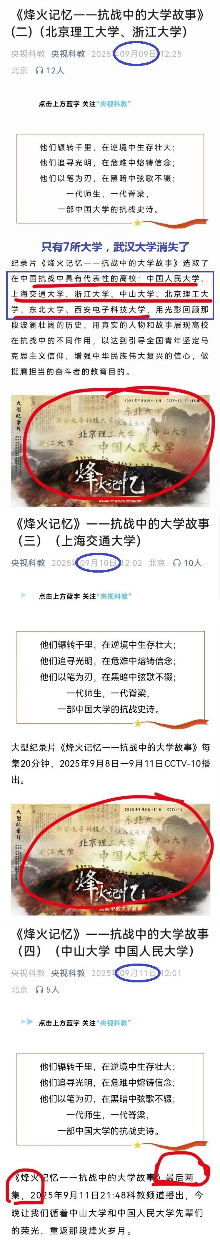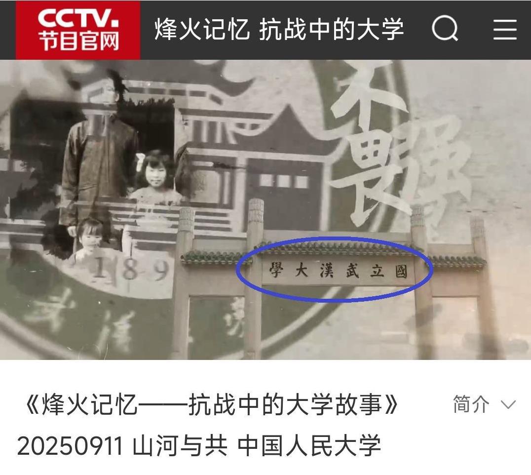 央视节目将武汉大学删除! 央视节目《烽火记忆——抗战中的大学故事》,本来选取了8所高校,展现他们在抗日战争中的作用,以教育后人,增强民族信心。 9月8号前,介绍文字里还是完整的8所大学,里面包含武汉大学。9月8号后,武汉大学不见了,文字和图里只剩7所大学了。 略有遗憾的是,央视没有删干净,节目片头的图里还有武汉大学的名字!