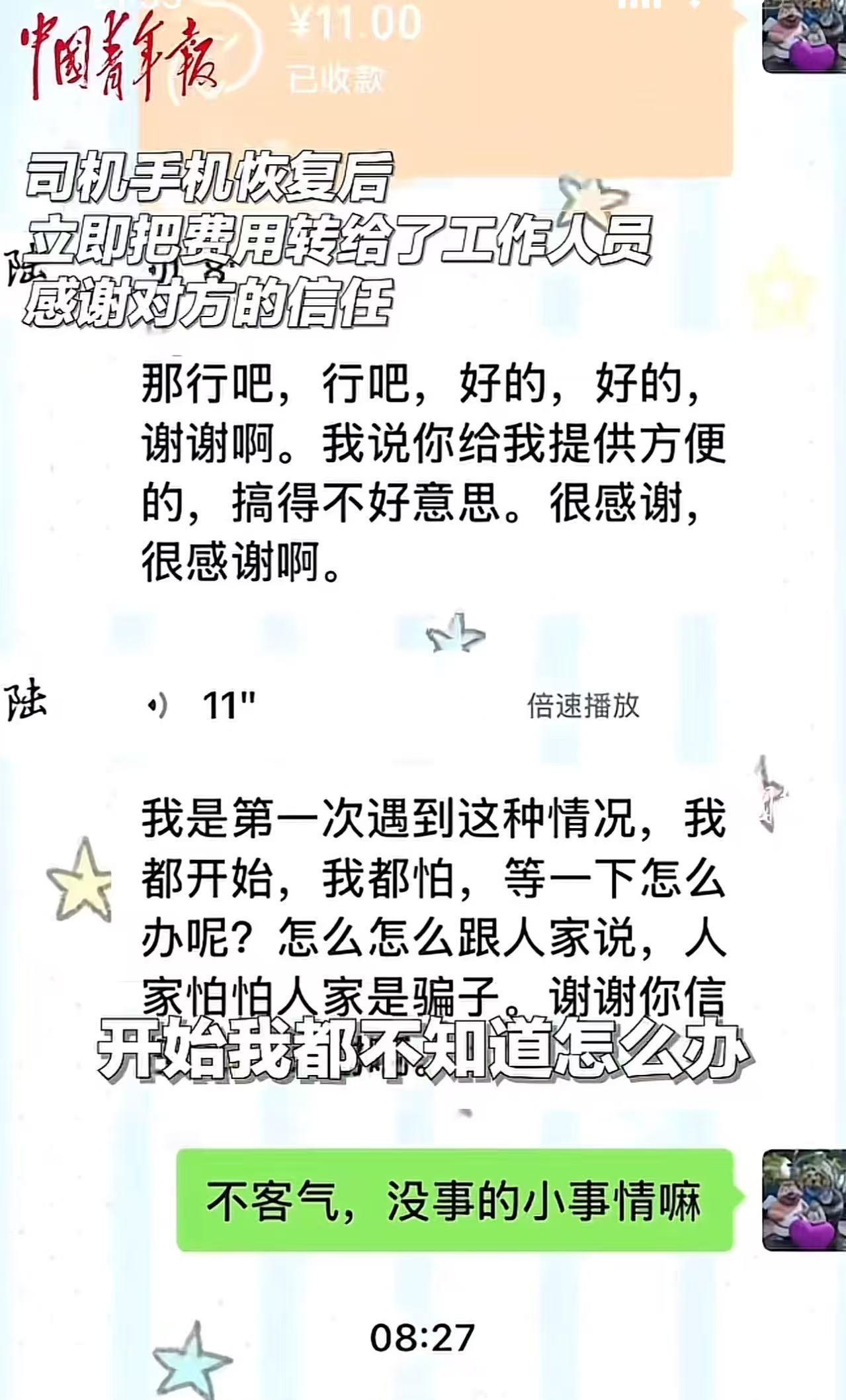 “浙江高速又火了!”男子过收费站时,手机突然开不了机,无法付钱,一脸紧张地问收费员该怎么办?而收费员的做法,把男子感动坏了!男子:“谢谢你愿意相信我,没有把我当骗子!” (来源:中国青年报) 前面就是收费站了,男子摸出手机,想提前调出付款码,可是手机突然黑屏死机,不管怎么按都没反应。 于是男子强制重启手机,可是手机屏幕一闪之后,怎么也开不了机。 男子急得额头冒汗,他出门没带现金,后面车子又有车子排队,只能硬着头皮把车挪到缴费窗口。 “那个,我手机突然坏了,现在没法付钱,该怎么办呢?” 说完这话,男子就涨红了脸,生怕被当成吃骗子!毕竟要交钱了,手机刚好坏了,哪有这么巧的事情。 可是万万没想到,收费员转身就去拿手机,说:"没事儿,我先帮您垫上,11块对吧?" 男子当场愣住,他想过被怀疑,被扣在高速上不让离开,就是没想过收费员会帮自己付钱! 于是他慌忙掏出身份证,往窗口塞:“这个先押您这儿,我修好手机立刻回来给你钱!” 收费员却笑着摆手:“不用不用,我给你留个号码,你回去后手机转我就行了!” 那一刻,男子突然觉得鼻尖发酸,喉咙像被什么堵住了,他擦着眼角连说了七八个"谢谢"后才离开。 修好手机以后,男子第一件事就是加收费员好友,说:“我是第一次遇到这种情况,我开始都怕,该怎么跟人家说,怕别人觉得我是骗子,谢谢你信任我。” “不客气,没事的,小事情嘛!”收费员回复。 男子回:“虽然是小事情,但是也体现你的善良,我们初次见面,你就能这样相信我,谢谢你……” 【评语】 这11元的故事,像一束穿透车流的光,照亮了陌生人之间最温暖的信任。 收费员用行动告诉我们:善良从不是需要权衡的交易,而是看见他人困境时本能伸出的手。 她或许只是做了件“小事”,却让一个陌生人重拾了对世界的信任! 这种不加思索的善意,才是人间最珍贵的通行证!