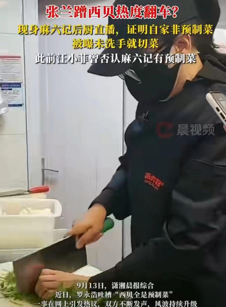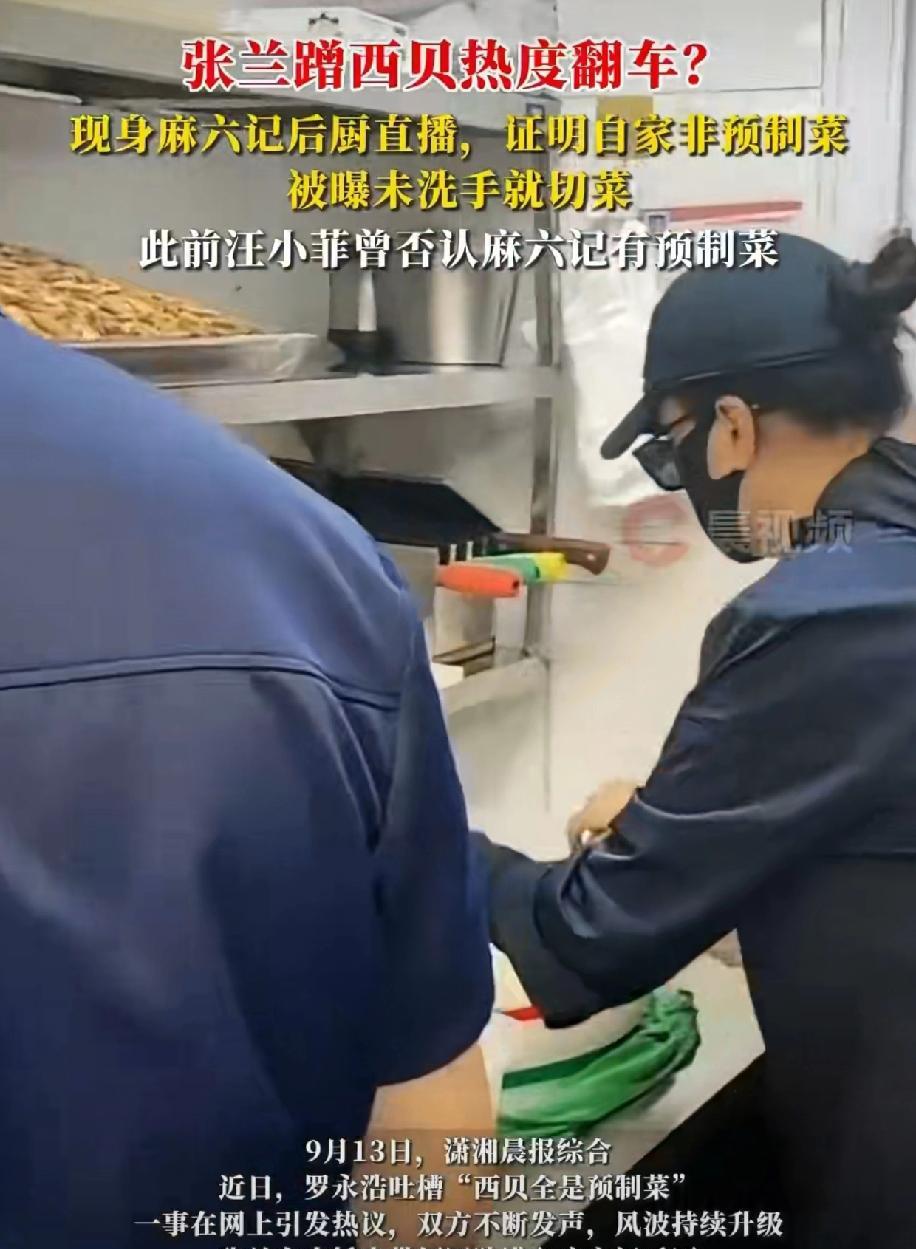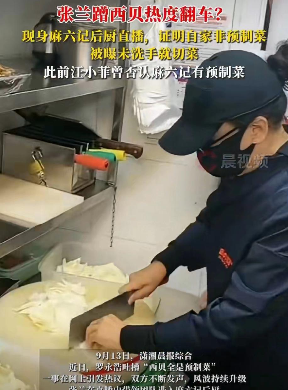 张兰搬起石头砸自己的脚了! 9月13日,西贝陷入预制菜风波后,张兰为蹭一波热度,带着直播进了麻六记的后厨,想彰显自己餐厅不是预制菜,但她进了后厨后,却没洗手就开始切菜了,之前还用手摸了头发,张兰也没有健康证。 网友们看到这一幕后都怒了,觉得张兰作秀过头了,想要踩着同行上位,结果搬起石头砸了自己的脚,暴露了自己的卫生意识堪忧。 而且张兰带进厨房的一群摄影师和小助理,也都没有健康证,口罩帽子都没有带。 另外张兰说要证明他们不是预制菜,但直播间的镜头一直都在切小配菜上,主料一个没展示,又怎么证明不是预制菜呢? 前几年张兰和汪小菲还说过为了保证连锁店的口味都一样,他们都是中央厨房做好后配送的,这不就是预制菜吗?