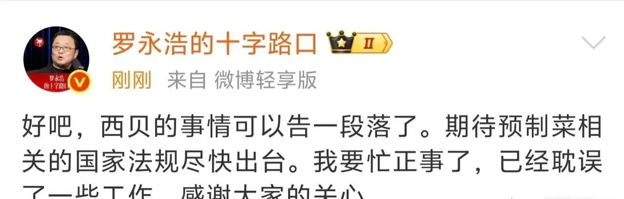 西北的西贝,在老辣的老罗面前,稚嫩得像个新兵蛋子。老罗:我也不知道啊,对方上来就给自己插了两刀,我这还没发力呢,他自己就倒下了。 网友调侃,在自信和自证之间,西贝选择了自杀。邀请媒体到后厨参观,本想自证清白,结果却成了大型翻车现场,当记者的摄像头对准保质期24个月的西兰花的时候,场面一度尴尬到冷场。 打铁还需自身硬,西贝想象中的自己,是餐饮界的“胖东来”,实际上的自己,却成了一个小丑。 老罗从来没有反对预制菜,他反对的是明明是预制菜,却打死不承认,非说自己是现炒现卖。老罗自始至终,要求的只是“知情权”三个字而已。 接下来的剧情,已经失去悬念了。老罗可能也觉得没劲,亲自发文说西贝的事情已经告一段落了。看出来了,老罗多少有点不忍心。