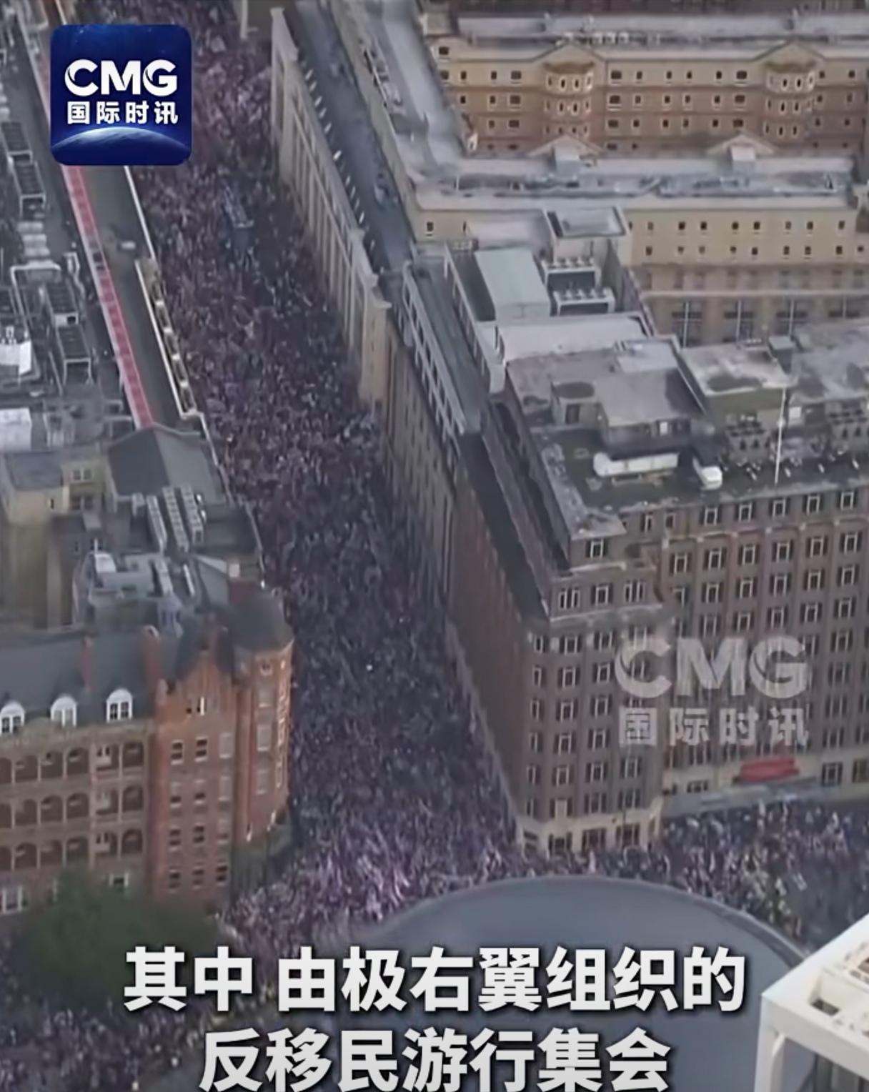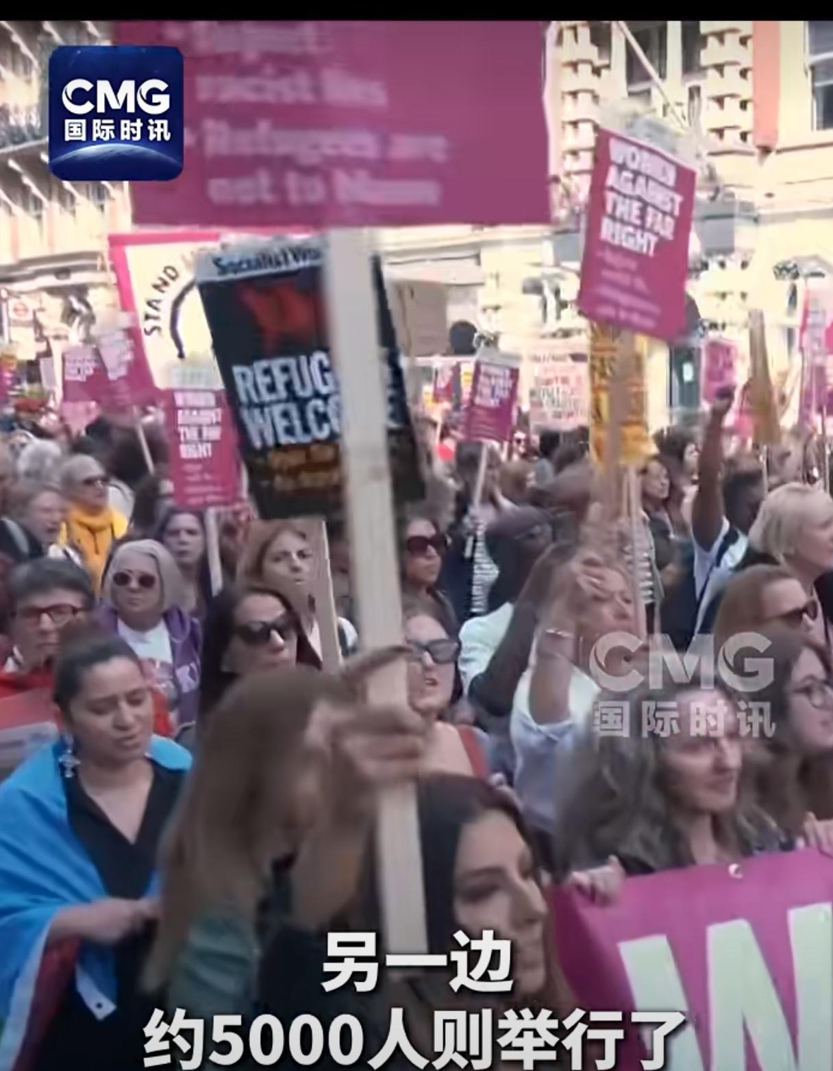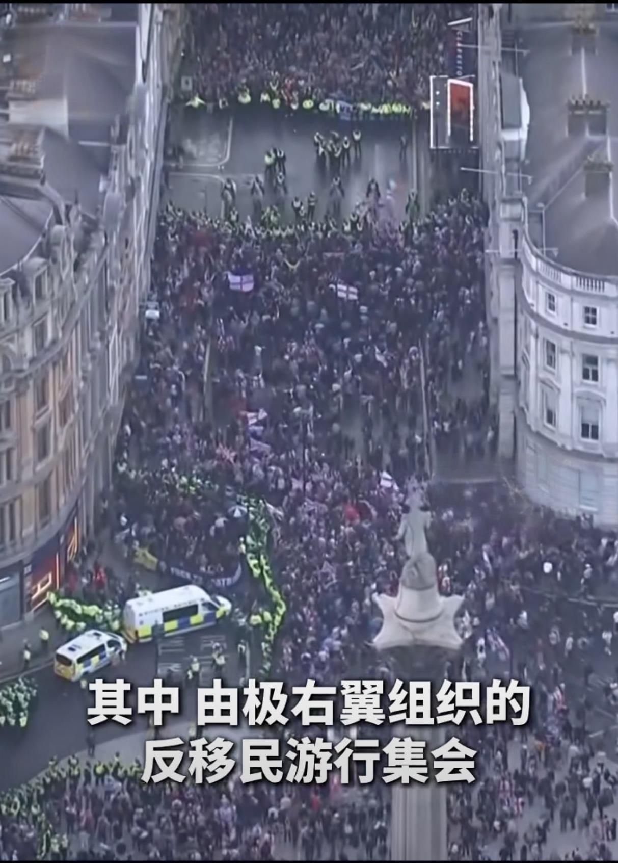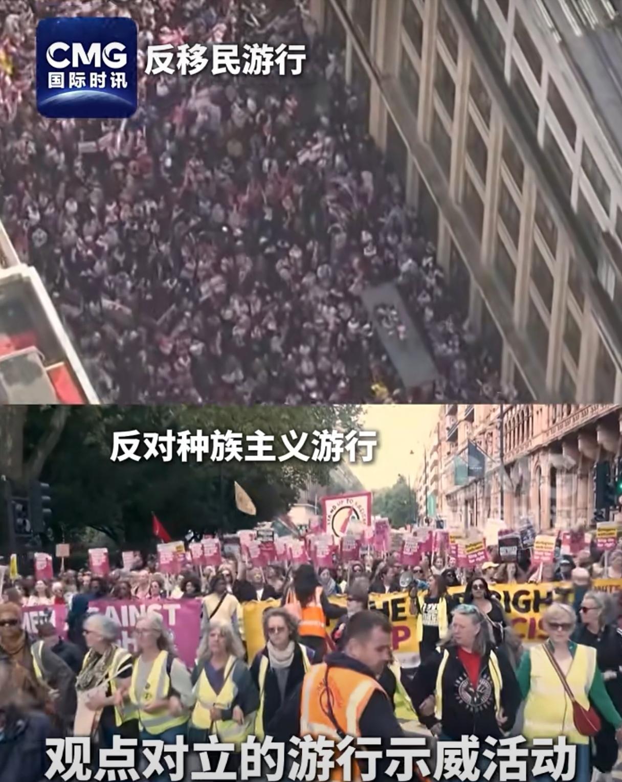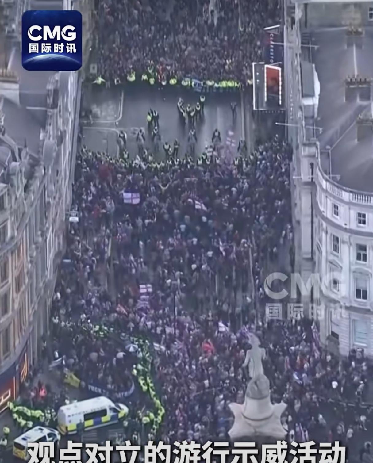 英国发生两波不同诉求的大规模示威游行活动。一波是反移民游行,参加人数超过10万;