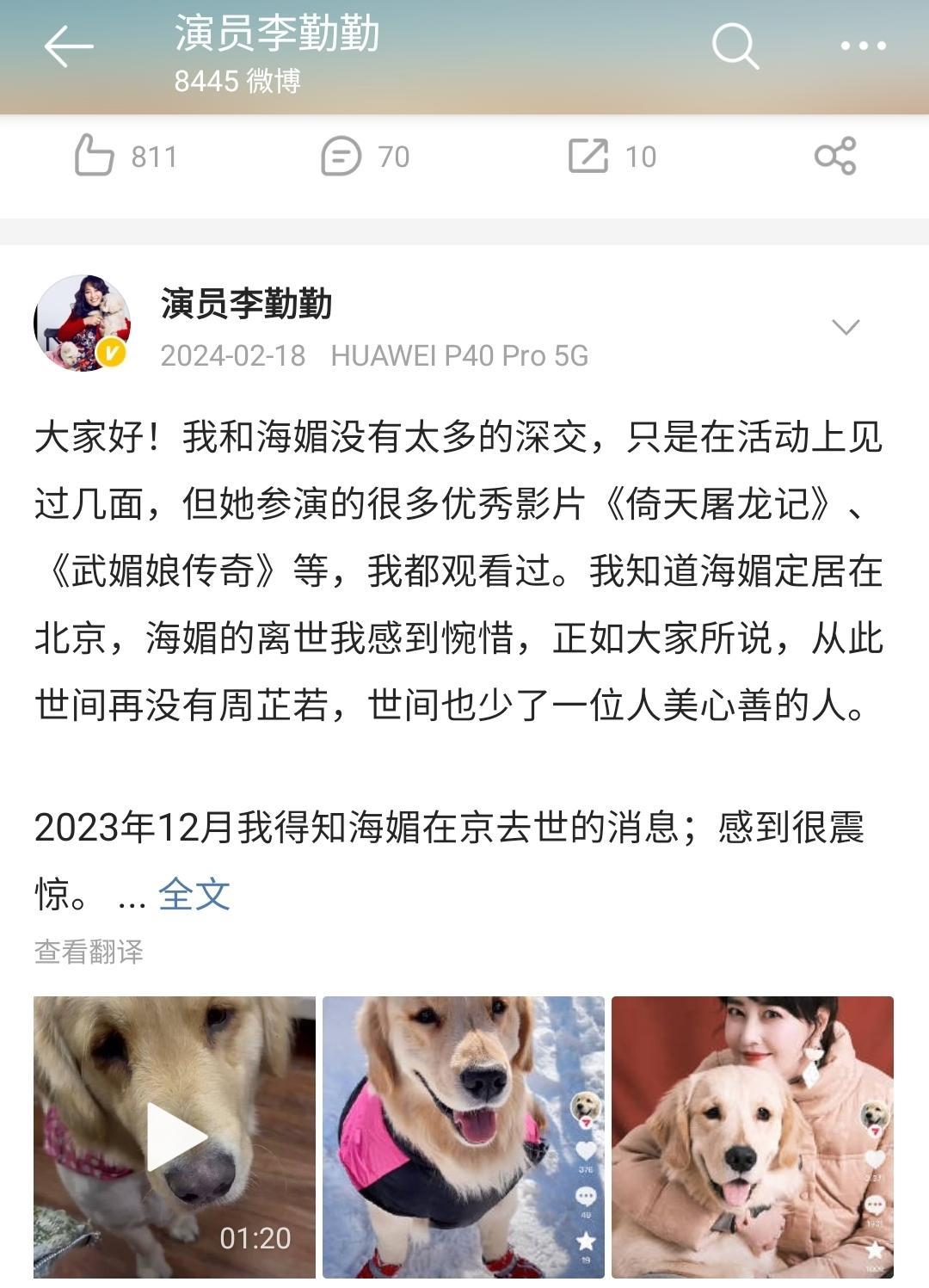 女演员李勤勤愿意收养于朦胧的狗! 于朦胧去世后,粉丝们讨论最多的,除了遗憾,就是于朦胧的两只狗怎么办。 对此,很多网友甚至在网上私信了很多明星好友。 导致,李勤勤主动发文,说愿意收养于朦胧的两条狗,但尊重家属安排,如果有需要,自己能兜底。 之前周海媚老师的狗也是她接过来养的,平时还总救流浪狗,照顾毛孩子超有经验。 这次站出来,也是“义不容辞”了。 但容我说句不好听的,于朦胧生前多疼那俩狗啊,家属大概率会自己养 ,毕竟是对他的念想。 但李勤勤这主动兜底的心意太戳人,要是于朦胧泉下有知,看到有圈内前辈这么帮衬,肯定也能安心一点吧!
