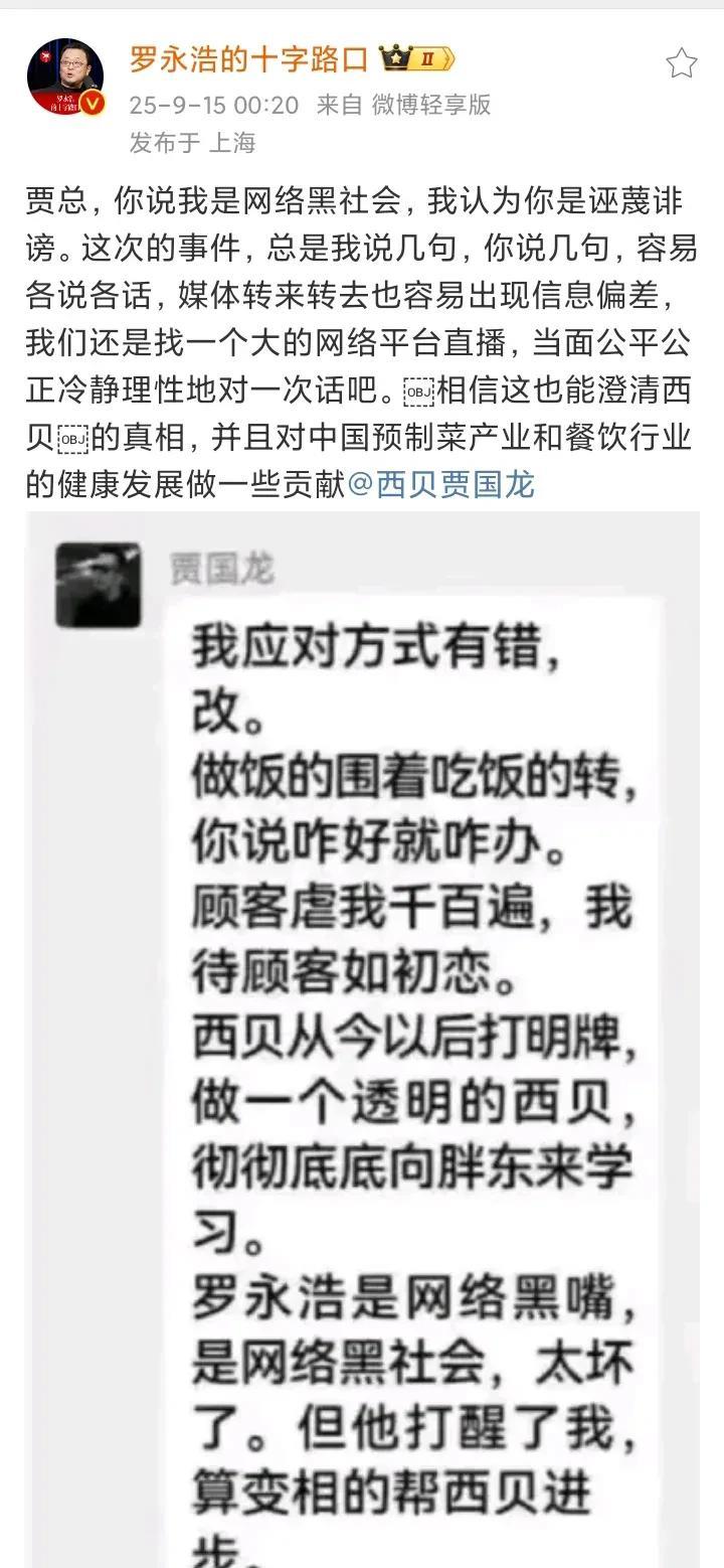 罗永浩怒了,将公开“锤”贾国龙3次,对西贝发起3次诉讼: 第一,西贝推出“罗永浩套餐”,利用他的名字促销,这是侵权,他要起诉; 第二,贾老板说罗永浩是网络黑社会,涉嫌诽谤与污蔑,他要起诉; 第三,西贝卖预制菜却说自己不是预制菜,涉嫌虚假宣传,他将组织集体诉讼; 西贝做大也不容易,罗永浩本来已经就此揭过,放贾老板一马,没想到贾老板来了一句“罗永浩是网络黑社会”,这下罗永浩被彻底激怒了,他决定举起“锤子”,像砸西门子冰箱一样“砸”贾国龙,并且立下誓言,与贾国龙绝无和解可能,谁来当中间人劝和就和谁绝交,真正的好戏,现在才开始!