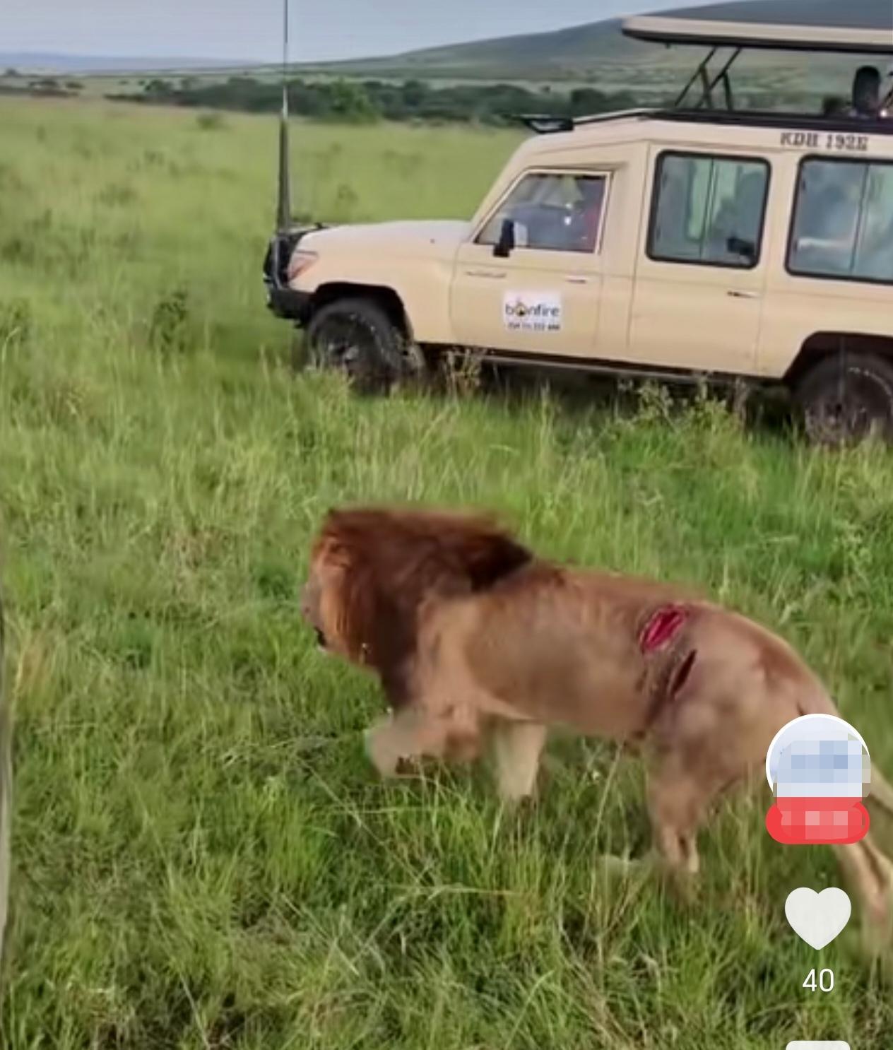 在非洲大草原上,有探险的老外拍到一只雄狮,朝探险车走来,当雄狮走过的时候,老外发现雄狮的背上有两三道很深的刀痕,外面的皮肤已经裂开,露出了里边的肉体组织,看上去非常的吓人。