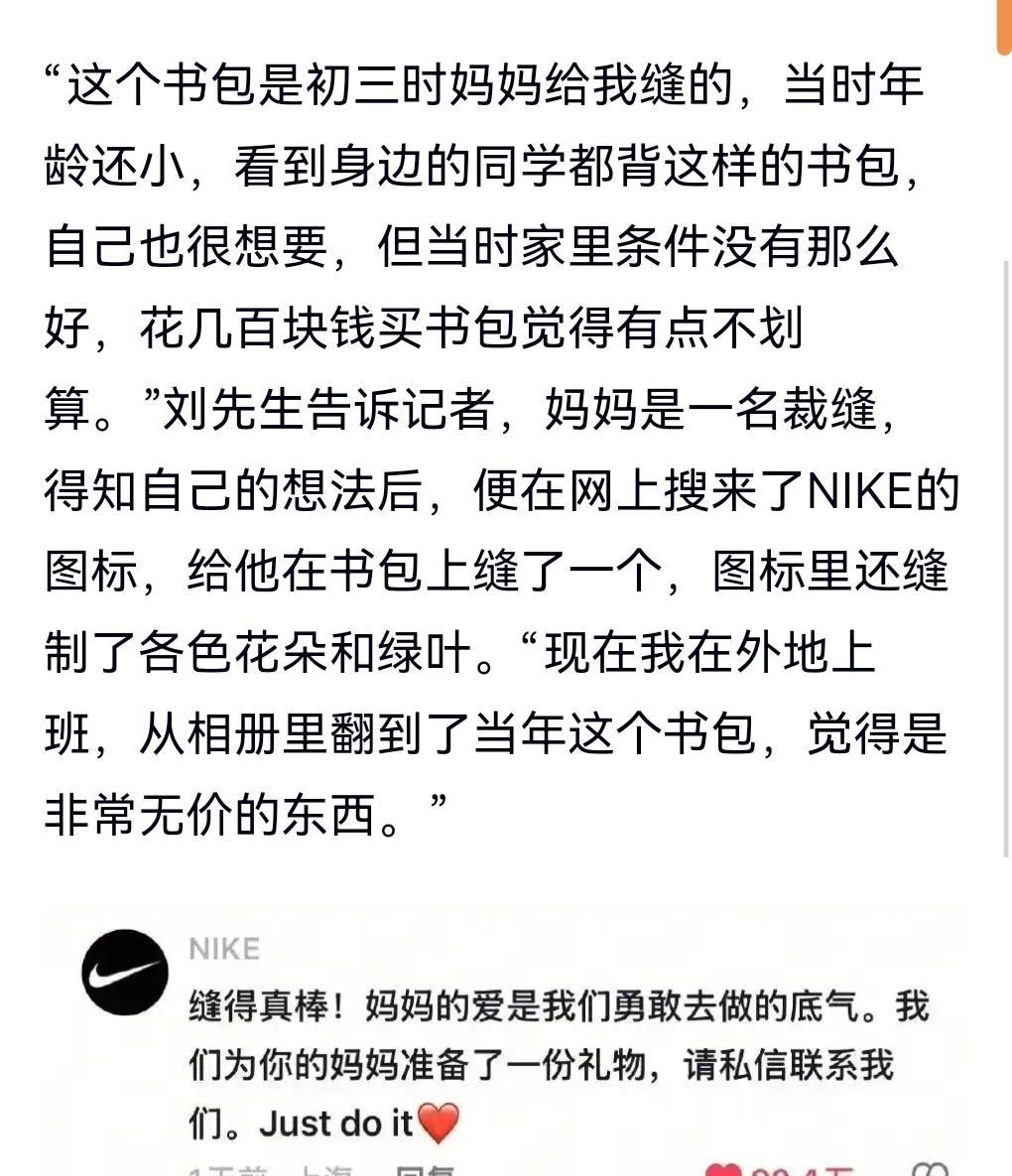 这手艺也太好了。 妈妈亲手缝的耐克书包火了。 就是15日在网上看到这么一个新闻,一男子透露他初三的时候想要一个耐克包,但是没钱买,他妈妈就给他缝了一个。 缝的真好。 耐克官方上说要送他们礼物,引发热议,官方评论已删除。