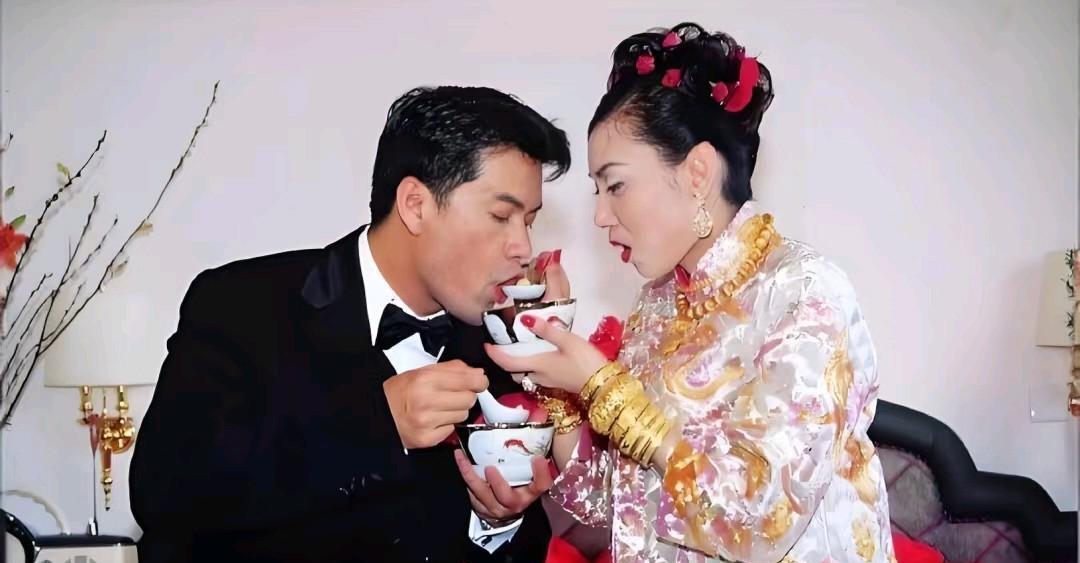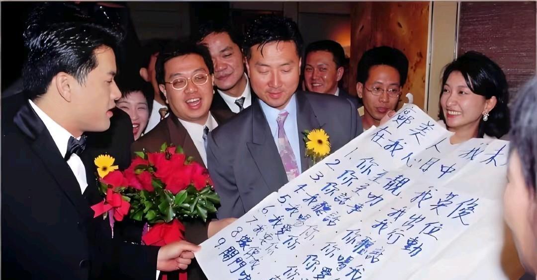 1996年,吕良伟和邝美云的结婚照,姐妹团成员强大,钟丽缇、陈淑兰、关淑怡等人,兄弟团则有何家劲、苗侨伟、黄光亮和黄子扬等人。