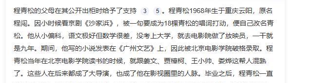 程青松家庭背景曝光! 原来这么牛,难怪他能创办金扫帚奖! 程青松是重庆云阳县南溪镇人,可以说从小在南溪镇他就是个人物!他的妈妈是南溪小学的老师,姑姑是这所学校的校长,有两层关系,在校园里程青松可以说横着走都行!在小学里他就已经开始偏科,偏爱文科讨厌理科,打小就爱写作,从小就有一个电影梦,本来父母给他取名叫程闯,希望他能闯出一片天地。没想到他小时候看了一部《沙家浜》京剧后,被里面一句歌词打动,自己给自己改了名,才有了现在的程青松名字,他的行为在那时候就已经很不一般。 到了中学又还是他的天地,他的姑父是南溪中学的校长。中学后程青松偏科更严重了,没能考上他心仪的北京电影学院,但是他却做了一个惊人的举动。他跑去电影院那当放映员,当了九年,靠着九年放映观看电影的经验,写出了一部轰动的小说,硬是让北京电影学院破例录取了他。 值得一提的是,他的父母对他的取向很支持,在混娱乐圈后,程青松每一年都有很出色的表现,他的简介非常牛,是导演、编剧、策划人、制片人等,非常有话语权。还创办了金扫帚奖,任何明星演技他都能评论一番。还写过一本叫《无性别时代的爱情》的小说,真的不是等闲之辈啊!