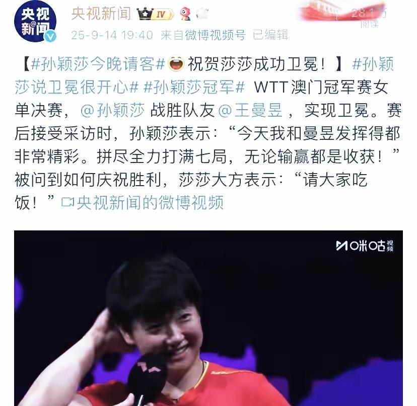 央妈原来跟我们一样, 也关心莎莎如何庆祝。[偷笑] 莎莎苦战7局, 4-3战胜曼昱, 成功卫冕澳门冠军赛。 现场被问如何庆祝, 莎莎有点害羞地说: “跟同同一样,请大家吃饭”! 谁能想到, 央妈也喜欢听这个消息, 把莎莎请吃饭报了出来, 这是要莎莎的钱包瘦身啊! 不得不说, 人人都是自媒体的今天, 央媒也越来越接地气了, 大家喜欢看啥就报道啥![送心] #记录真实生活#