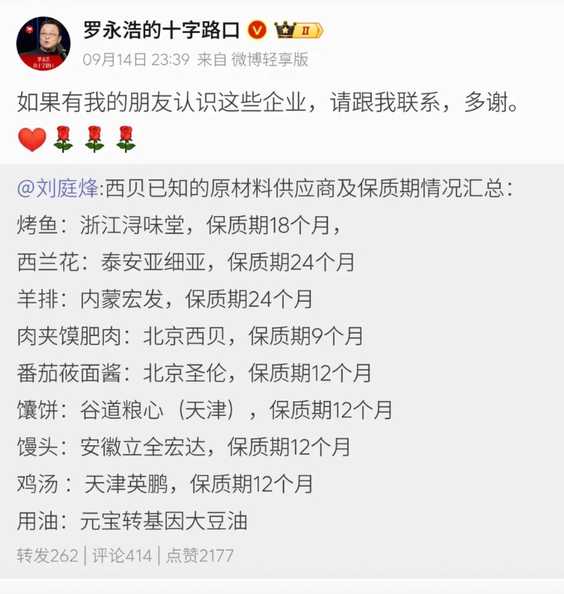 有人调停了,罗老师也认了,贾老板又捅自己几刀,想证明自己很有能耐。贾老板这么搞,西贝倒掉快则三月,慢则半年。老罗本来想着差不多可以了,没有必要一棒打死,结果他又跳起来咬了一口,说老罗是网络黑社会,以老罗的性格这下西贝估计渣都不剩了。 老贾为啥炸,预制菜这事被捅出去,对于老乡鸡这种消费价格的店来说不算什么,就像全国人民都知道吃华xx拉稀也没阻止它接着开分店一样,老百姓知道什么价位得到什么东西,但他西贝不一样啊,本来就贵的要死,给人的感觉是上档次是高端,结果被爆用的是预制菜,跟老乡鸡跟平民快餐一个规格,那他以后还怎么做生意? 他客单价不可能再做得起来,舆论一发酵变成梗了以后,他西贝可能以后都开不下去想清楚这个层面后,第一反应就不应该是把观众焦点集中在预制菜上,要么装死别回嘴,要么拿别的事说事,实在不行买个更热的搜把这事盖下去,结果他们选了最蠢的嘴硬,曝光自家中央厨房,上赶着给别人送子弹,这次西贝真的是完蛋了。 预制菜的事因为国家标准也不明确,咱先不谈!我们说说他用的油,我仔细看了下西贝用的油,五六年前在学校食堂里就已经禁用了!考虑到食堂和西贝之间收费的天差地别,感觉西贝死一回也不是不可以!西贝这种店能活到今天,消费者真的就没有一点责任吗? 还有一个对西贝非常不利的消息,这是老罗开始搜罗西贝的上游供应链公司了。 这是要釜底抽薪了。