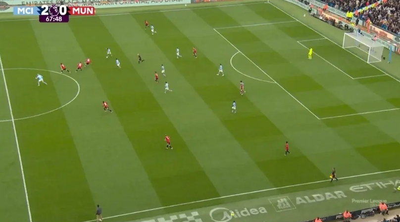 我给你看看两张图:分别是曼联第二个、第三个失球之前的截图。你发现没有?4后卫,约罗是顶在中场位置的。阿莫林用来解决中场人数不足、B费不适合担任后腰的方式,就是一个中后卫顶上去,跟卡塞米罗或乌加特搭档双后腰,让B费去前腰位置。