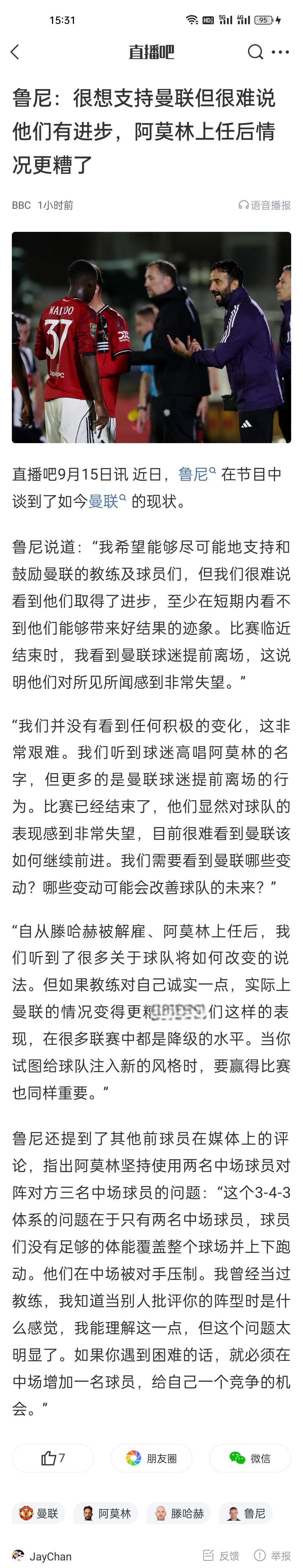 鲁尼:很想支持曼联但很难说他们有进步,阿莫林上任后情况更糟了。 最晚第8轮定生死,阿莫林是真头铁,还记得3年前藤子刚上来信心满满前两轮直接被干懵了,马上转蹲坑马上成绩上来了,在英超成绩永远是第一位的,没有成绩的保证,任何在先进的打法都没有,藤子的战术不比阿莫林的差,就是玩不转的,改打法才能争取更多的时间证明自己。 曼联找教练有点奇怪,近四任教练都是从其他联赛挖来的,不是不能从其他联赛挖,但不容易最快速度出成绩获得球员信任, 弗爵爷之后成绩最好的是穆里尼奥,他熟悉英超联赛,孔二愣子应该是最好的最适合曼联啦,有能力有魄力有又熟悉英超。