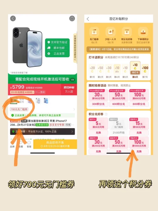 4️⃣ 到手价=商品券前价-商品无门槛券-积分限时券。下单2025苹果秋季新品,至高直降1000元!