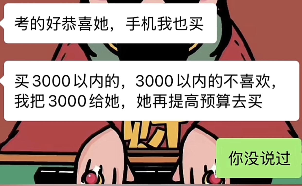 一女生发文说男朋友来我家吃饭时答应她妹妹说只要妹妹考上本科就送给她一台手机。现在妹妹大学考上了,男朋友却不愿意买了。女生直接网购买了一台价值9500的苹果手机,然后购买截图发给男生让他报销,并询问男生是否已经把这件事忘了。 男生震惊的表示女生太看得起他了,随后就让女生换一个,但女生表示已经晚了,昨天快递就到了。 男生见状只发了3000元给女生,并表示女生要买什么手机都没跟他商量一下,现在买的手机已经超出他的预期范围了,他出3000元,剩下让她这个当姐姐的出。 女生生气的说她没说要送妹妹手机,说男生自己说的,现在让男生快点的给钱,并反问男生这点钱还超出你的能力范围?你一个月赚那么多,还表明男生一年赚十几万她才买的苹果。 男生同样生气的,表示我自己都舍不得用1万的手机,亲爹亲妈都没用上,女生倒是提前给妹妹安排上了,还说他说的不是能力范围,而是预期范围。 女生见男友不接受,当即委屈道你别耍赖,我妹妹考的那么好,奖励一个好手机不是应得的吗? 而男生表示她考的好恭喜她,手机他也给买,但是他只愿意出3000元,3000元以内她不喜欢,那他把3000元给她,超过的部分她自己提高预算去买, 但女生反驳道他没说过,说的是考上本科就买手机,没说3000以内以内。见女生依旧不依不饶,男生直接告诉女生自己做的没问题,她妹妹最多是个小姨子,他和女生还没结婚呢,跟她妹妹真的没关系。女生说以后她们迟早会结婚,妹妹和他到时就是一家人了。 男生听完后说他母亲今年身体老疼了,让女生给男友妈妈买一个1万的轮椅,他就把剩下的钱给她,并表明他母亲以后也和女生是一家人。女生见男生油盐不进,于是就愤怒道,自己没说过要给男生母亲买,现在她不强求男生把钱给她了。并表示男人说话不算数,她算看透男生了。 网友看到后绷不住了,说女生明明可以先和男生商量,为什么要先斩后奏。而且看到别人工资高就买这么贵的合适吗?