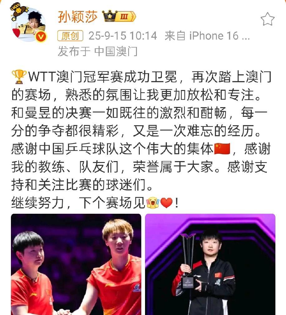 孙颖莎更新微博,先说感想后说感谢。 感谢所有台前幕后,还有喜欢她的球迷。 又是一次难忘的经历,当然要分享美图。 孙颖莎只分享两张图片,一张自己抱奖杯,一张和曼昱握手,并没有分享顶峰相见图。 昨晚冠军时刻,王楚钦和孙颖莎有自拍,有合照,还有城市宣传片,但莎莎还是选择低调。 昨天王楚钦拍照都很严肃,私下两个人有说有笑有交流。 现在网络大环境不好,国乒队员都选择低调,包括有说林诗栋和蒯曼没交流,私下人家都是好朋友,只是都学会保护好自己。 加油莎莎,下一站北京大满贯,期待你再次卫冕。 图片来自网络侵权可删。
